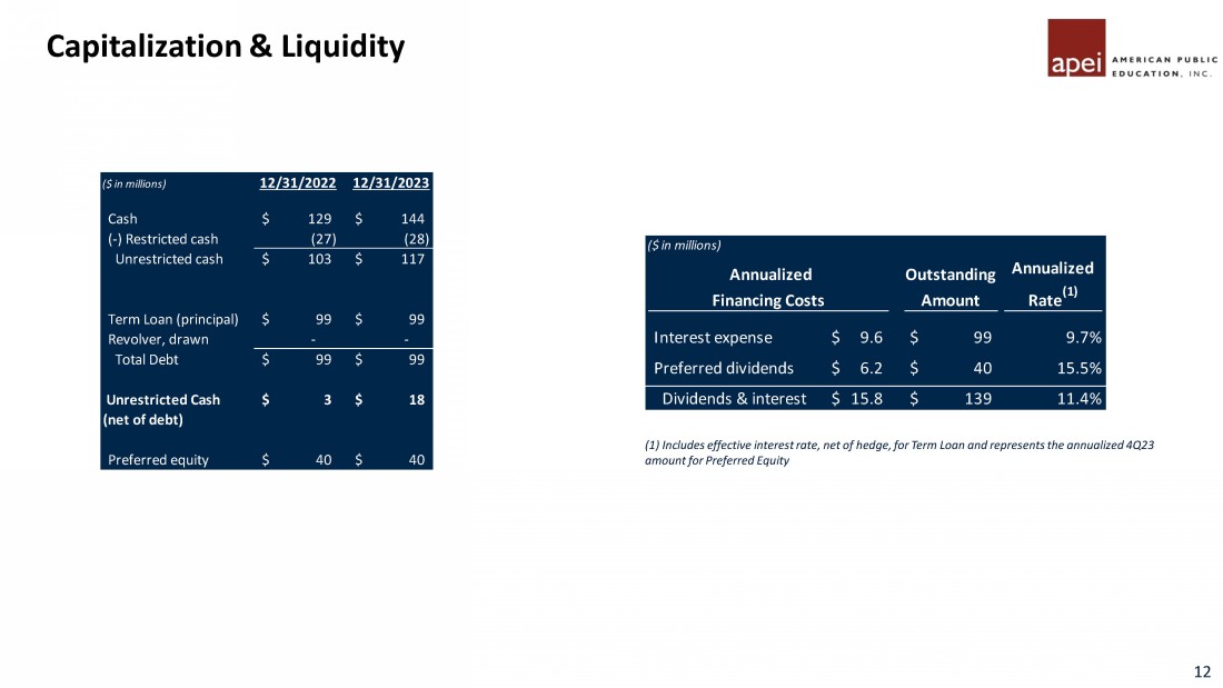Education Unit EBITDA and Margin Profile 11 Continued margin growth to 35% in 4Q23 driven by higher enrollments, select price increases, and lower marketing spend 4Q23 Positive EBITDA driven by slowing enrollment declines and impact of aligning cost structure with lower revenue base Positive EBITDA in 4Q23 due to higher enrollments and revenue, driving 7% margin in 4Q23 Lower 4Q23 revenue and EBITDA driven by impact of US Gov’t.’s continuing resolution Note: See note 16 to the financial statements included in the 2023 10 - K. Reflects income (loss) from operations before interest, incom e taxes, gain (loss) from acquisitions, + depreciation & amortization. Please refer to slide 17 and appendix for GAAP to non - GAAP reconciliation. 1 Rasmussen excludes a non - cash impairment of $144.9M in 2Q22, $2.0M in 4Q22, and $64M in 2Q23. Also excludes $3.9M and $2.4M for Collegis transition services expense in 4Q22 and 1Q23, respectively. 2 Graduate School and Corporate combined comprise the Corporate & Other segment, as discussed in footnote 16 within the 2023 10 - K disclosure. 2 1 2 Segment Summary ($ in millions) 1Q22 2Q22 3Q22 4Q22 1Q23 2Q23 3Q23 4Q23 Revenue $73.1 $69.9 $68.7 $73.4 $74.0 $73.6 $76.4 79.4$ EBITDA $14.9 $15.2 $14.1 $20.6 $18.5 $20.2 $23.3 27.7$ Margin 20% 22% 21% 28% 25% 28% 30% 35% Revenue $67.1 $63.9 $61.5 $60.7 $57.5 $52.0 $52.1 52.6$ EBITDA $7.0 $4.5 ($1.9) ($1.1) ($4.5) ($7.1) ($5.3) 0.4$ Margin 10% 7% -3% -2% -8% -14% -10% 1% Revenue $11.5 $11.5 $11.4 $12.6 $13.1 $14.3 $13.7 15.8$ EBITDA ($0.8) ($0.4) ($1.1) ($0.7) ($1.0) $0.1 ($0.3) 1.1$ Margin -7% -3% -10% -6% -8% 1% -2% 7% Revenue $3.0 $4.3 $7.8 $5.7 $5.1 $7.4 $8.6 5.1$ EBITDA ($1.4) ($1.6) $1.8 $0.1 ($1.3) $0.8 $1.6 (1.1)$ Margin -48% -37% 22% 2% -25% 11% 18% -22% Corporate (6.3)$ (6.0)$ (5.9)$ (5.4)$ (6.9)$ (7.4)$ (5.7)$ (7.1)$ Consolidated Revenue $154.7 $149.6 $149.5 $152.4 $149.7 $147.2 $150.8 152.8$ Consolidated EBITDA $13.3 $11.8 $7.0 $13.6 $4.8 $6.7 $13.4 21.0$ (+) Adjustments 4.1$ 2.8$ 2.5$ 1.9$ 2.2$ 2.1$ 4.7$ 4.7$ Consolidated Adj. EBITDA 17.4$ 14.6$ 9.5$ 15.4$ 7.0$ 8.8$ 18.1$ 25.7$ Margin 11% 10% 6% 10% 5% 6% 12% 17% APEI APUS RU HCN GSUSA