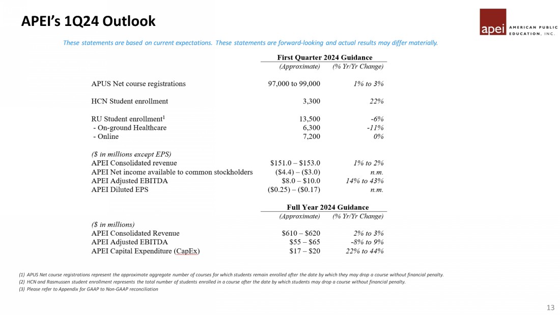 These statements are based on current expectations. These statements are forward - looking and actual results may differ materially. (1) APUS Net course registrations represent the approximate aggregate number of courses for which students remain enrolled after the date by which they may drop a course without financial penalty. (2) HCN and Rasmussen student enrollment represents the total number of students enrolled in a course after the date by which stu den ts may drop a course without financial penalty. (3) Please refer to Appendix for GAAP to Non - GAAP reconciliation APEI’s 1Q24 Outlook 13