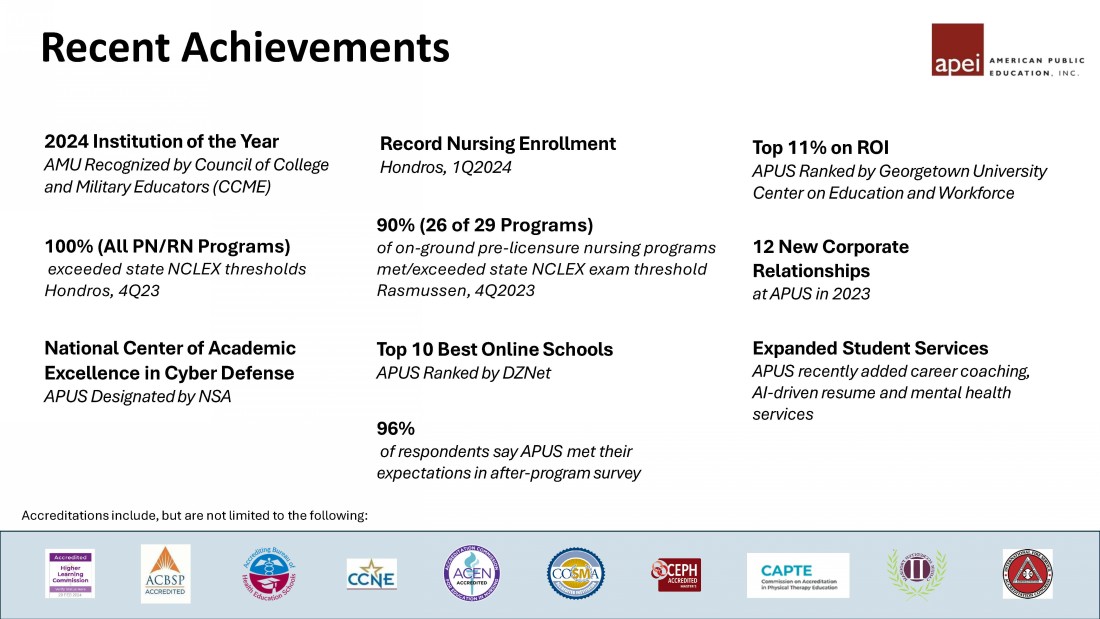 Record Nursing Enrollment Hondros , 1Q2024 Recent Achievements 2024 Institution of the Year AMU Recognized by Council of College and Military Educators (CCME) Top 10 Best Online Schools APUS Ranked by DZNet Top 11% on ROI APUS Ranked by Georgetown University Center on Education and Workforce National Center of Academic Excellence in Cyber Defense APUS Designated by NSA 12 New Corporate Relationships at APUS in 2023 96% of respondents say APUS met their expectations in after - program survey 90% (26 of 29 Programs) of on - ground pre - licensure nursing programs met/exceeded state NCLEX exam threshold Rasmussen, 4Q2023 Accreditations include, but are not limited to the following: Expanded Student Services APUS recently added career coaching, AI - driven resume and mental health services 100% (All PN/RN Programs) exceeded state NCLEX thresholds Hondros, 4Q23