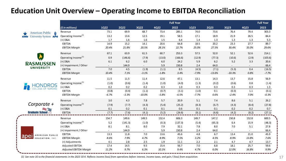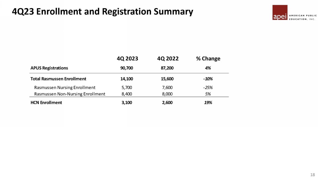 Education Unit Overview – Operating Income to EBITDA Reconciliation (1) See note 16 to the financial statements in the 2023 10 - K. Reflects income (loss) from operations before interest, income taxes, and gain / (loss) from acquisition. 17 Corporate + APEI Revenue Full Year Full Year ($ in millions) 1Q22 2Q22 3Q22 4Q22 2022 1Q23 2Q23 3Q23 4Q23 2023 Revenue 73.1 69.9 68.7 73.4 285.1 74.0 73.6 76.4 79.4 303.3 Operating Income (1) 13.2 13.6 12.5 19.1 58.5 17.1 18.9 21.9 26.5 84.4 (+) D&A 1.7 1.6 1.6 1.5 6.4 1.4 1.3 1.3 1.3 5.3 EBITDA 14.9 15.2 14.1 20.6 64.8 18.5 20.2 23.3 27.7 89.7 EBITDA Margin 20.4% 21.8% 20.5% 28.1% 22.7% 25.0% 27.5% 30.4% 35.0% 29.6% Revenue 67.1 63.9 61.5 60.7 253.3 57.5 52.0 52.1 52.6 214.1 Operating Income (1) 0.9 (146.6) (7.9) (13.0) (166.6) (12.9) (77.3) (10.6) (2.9) (103.6) (+) D&A 6.1 6.2 6.0 6.0 24.2 5.9 6.2 5.2 3.3 20.6 (+) Impairment / Other - 144.9 - 5.9 150.8 2.4 64.0 - - 66.4 EBITDA 7.0 4.5 (1.9) (1.1) 8.5 (4.5) (7.1) (5.3) 0.4 (16.5) EBITDA Margin 10.4% 7.1% -3.1% -1.8% 3.4% -7.9% -13.6% -10.3% 0.8% -7.7% Revenue 11.5 11.5 11.4 12.6 47.1 13.1 14.3 13.7 15.8 56.9 Operating Income (1) (1.0) (0.6) (1.4) (1.0) (4.0) (1.3) (0.2) (0.6) 0.8 (1.4) (+) D&A 0.2 0.2 0.2 0.3 1.0 0.3 0.3 0.3 0.3 1.3 EBITDA (0.8) (0.4) (1.1) (0.7) (3.1) (1.0) 0.1 (0.3) 1.1 (0.1) EBITDA Margin -6.7% -3.3% -10.0% -5.8% -6.5% -7.7% 0.6% -2.4% 7.0% -0.3% Revenue 3.0 4.3 7.8 5.7 20.9 5.1 7.4 8.6 5.1 26.2 Operating Income (1) (7.9) (7.7) (4.3) (5.4) (25.2) (8.3) (6.7) (4.3) (8.4) (27.8) (+) D&A 0.1 0.2 0.1 0.1 0.6 0.1 0.1 0.2 0.2 0.7 EBITDA (7.7) (7.6) (4.1) (5.2) (24.6) (8.1) (6.6) (4.2) (8.2) (27.1) Revenue 154.7 149.6 149.5 152.4 606.3 149.7 147.2 150.8 152.8 600.5 Operating Income (1) 5.2 (141.3) (1.0) (0.3) (137.3) (5.4) (65.3) 6.4 15.9 (48.3) (+) D&A 8.1 8.1 8.0 7.9 32.1 7.8 8.0 7.0 5.1 27.8 (+) Impairment / Other - 144.9 - 5.9 150.8 2.4 64.0 - - 66.4 EBITDA 13.3 11.8 7.0 13.6 45.6 4.8 6.7 13.4 21.0 45.9 EBITDA Margin 8.6% 7.9% 4.7% 8.9% 7.5% 3.2% 4.5% 8.9% 13.8% 7.6% (+) Adjustments 4.1 2.8 2.5 1.9 11.1 2.2 2.1 4.7 4.7 13.7 Adjusted EBITDA 17.4 14.5 9.5 15.4 56.7 7.0 8.8 18.1 25.7 59.6 Adjusted EBITDA Margin 11.2% 9.7% 6.3% 10.1% 9.4% 4.7% 6.0% 12.0% 16.8% 9.9%