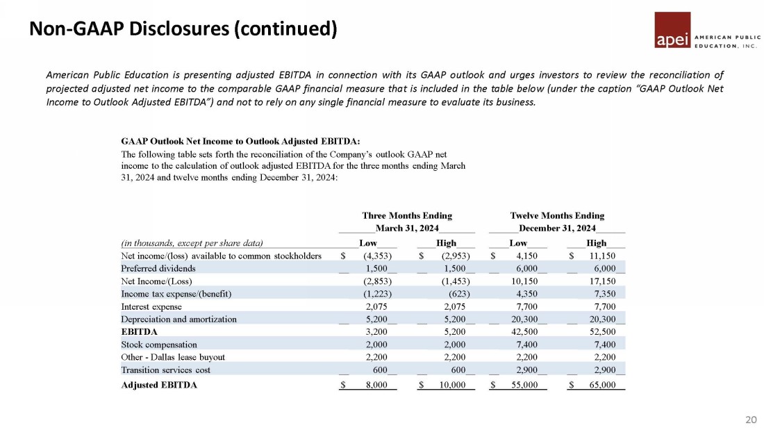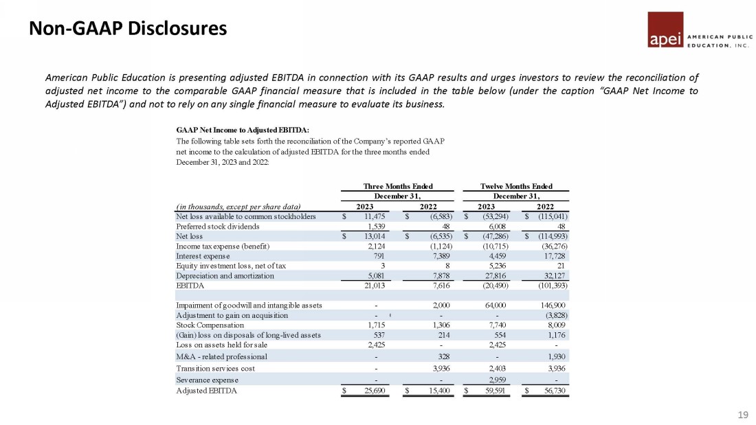 American Public Education is presenting adjusted EBITDA in connection with its GAAP results and urges investors to review the reconciliation of adjusted net income to the comparable GAAP financial measure that is included in the table below (under the caption “GAAP Net Income to Adjusted EBITDA”) and not to rely on any single financial measure to evaluate its business . Non - GAAP Disclosures 19 GAAP Net Income to Adjusted EBITDA:   (in thousands, except per share data)         Net loss available to common stockholders $ 11,475 $ (6,583) $ (53,294) $ (115,041) Preferred stock dividends 1,539 48 6,008 48 Net loss $ 13,014 $ (6,535) $ (47,286) $ (114,993) Income tax expense (benefit) 2,124 (1,124) (10,715) (36,276) Interest expense 791 7,389 4,459 17,728 Equity investment loss, net of tax 3 8 5,236 21 Depreciation and amortization 5,081 7,878 27,816 32,127 EBITDA 21,013 7,616 (20,490) (101,393) Impairment of goodwill and intangible assets - 2,000 64,000 146,900 Adjustment to gain on acquisition - 0 - - (3,828) Stock Compensation 1,715 1,306 7,740 8,009 (Gain) loss on disposals of long-lived assets 537 214 554 1,176 Loss on assets held for sale 2,425 - 2,425 - M&A - related professional - 328 - 1,930 Transition services cost - 3,936 2,403 3,936 Severance expense - - 2,959 - Adjusted EBITDA $ 25,690 $ 15,400 $ 59,591 $ 56,730 Twelve Months Ended December 31, 2023 2022 The following table sets forth the reconciliation of the Company’s reported GAAP net income to the calculation of adjusted EBITDA for the three months ended December 31, 2023 and 2022: Three Months Ended December 31, 2023 2022