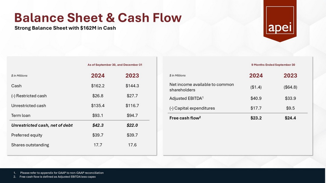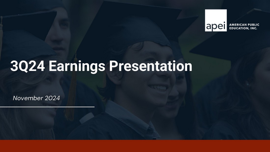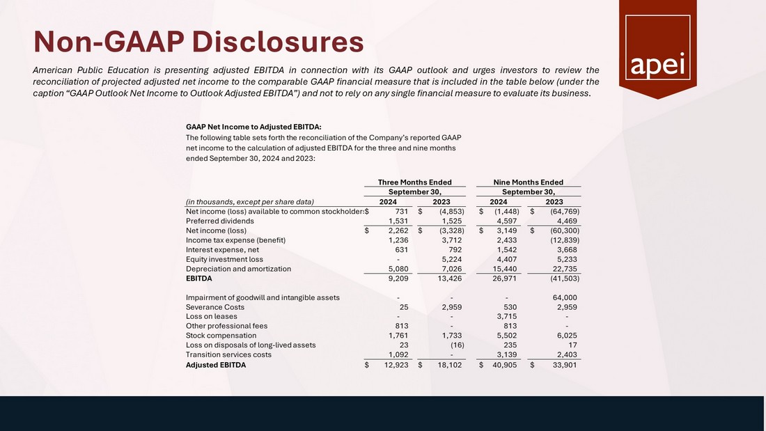 Non - GAAP Disclosures American Public Education is presenting adjusted EBITDA in connection with its GAAP outlook and urges investors to review the reconciliation of projected adjusted net income to the comparable GAAP financial measure that is included in the table below (under the caption “GAAP Outlook Net Income to Outlook Adjusted EBITDA”) and not to rely on any single financial measure to evaluate its business . GAAP Net Income to Adjusted EBITDA:   (in thousands, except per share data)         Net income (loss) available to common stockholders$ 731 $ (4,853) $ (1,448) $ (64,769) Preferred dividends 1,531 1,525 4,597 4,469 Net income (loss) $ 2,262 $ (3,328) $ 3,149 $ (60,300) Income tax expense (benefit) 1,236 3,712 2,433 (12,839) Interest expense, net 631 792 1,542 3,668 Equity investment loss - 5,224 4,407 5,233 Depreciation and amortization 5,080 7,026 15,440 22,735 EBITDA 9,209 13,426 26,971 (41,503) Impairment of goodwill and intangible assets - - - 64,000 Severance Costs 25 2,959 530 2,959 Loss on leases - - 3,715 - Other professional fees 813 - 813 - Stock compensation 1,761 1,733 5,502 6,025 Loss on disposals of long-lived assets 23 (16) 235 17 Transition services costs 1,092 - 3,139 2,403 Adjusted EBITDA $ 12,923 $ 18,102 $ 40,905 $ 33,901 Nine Months Ended September 30, 2024 2023 The following table sets forth the reconciliation of the Company’s reported GAAP net income to the calculation of adjusted EBITDA for the three and nine months ended September 30, 2024 and 2023: Three Months Ended September 30, 2024 2023
