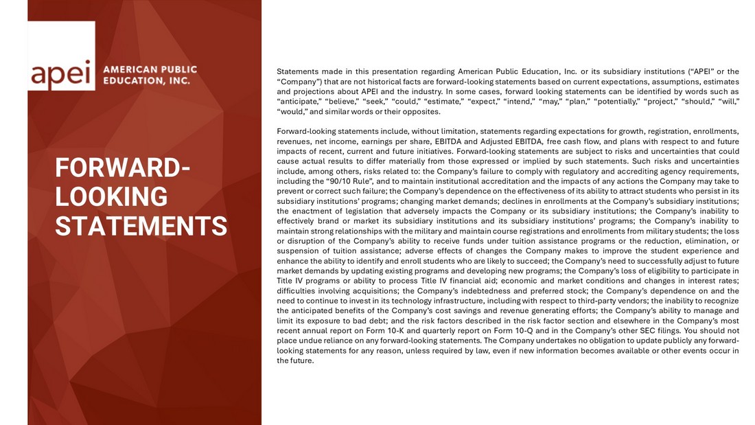 FORWARD - LOOKING STATEMENTS Statements made in this presentation regarding American Public Education, Inc . or its subsidiary institutions (“APEI” or the “Company”) that are not historical facts are forward - looking statements based on current expectations, assumptions, estimates and projections about APEI and the industry . In some cases, forward looking statements can be identified by words such as “anticipate,” “believe,” “seek,” “could,” “estimate,” “expect,” “intend,” “may,” “plan,” “potentially,” “project,” “should,” “will,” “would,” and similar words or their opposites . Forward - looking statements include, without limitation, statements regarding expectations for growth, registration, enrollments, revenues, net income, earnings per share, EBITDA and Adjusted EBITDA, free cash flow, and plans with respect to and future impacts of recent, current and future initiatives . Forward - looking statements are subject to risks and uncertainties that could cause actual results to differ materially from those expressed or implied by such statements . Such risks and uncertainties include, among others, risks related to : the Company’s failure to comply with regulatory and accrediting agency requirements, including the “ 90 / 10 Rule”, and to maintain institutional accreditation and the impacts of any actions the Company may take to prevent or correct such failure ; the Company’s dependence on the effectiveness of its ability to attract students who persist in its subsidiary institutions’ programs ; changing market demands ; declines in enrollments at the Company’s subsidiary institutions ; the enactment of legislation that adversely impacts the Company or its subsidiary institutions ; the Company’s inability to effectively brand or market its subsidiary institutions and its subsidiary institutions’ programs ; the Company’s inability to maintain strong relationships with the military and maintain course registrations and enrollments from military students ; the loss or disruption of the Company’s ability to receive funds under tuition assistance programs or the reduction, elimination, or suspension of tuition assistance ; adverse effects of changes the Company makes to improve the student experience and enhance the ability to identify and enroll students who are likely to succeed ; the Company’s need to successfully adjust to future market demands by updating existing programs and developing new programs ; the Company’s loss of eligibility to participate in Title IV programs or ability to process Title IV financial aid ; economic and market conditions and changes in interest rates ; difficulties involving acquisitions ; the Company’s indebtedness and preferred stock ; the Company’s dependence on and the need to continue to invest in its technology infrastructure, including with respect to third - party vendors ; the inability to recognize the anticipated benefits of the Company’s cost savings and revenue generating efforts ; the Company’s ability to manage and limit its exposure to bad debt ; and the risk factors described in the risk factor section and elsewhere in the Company’s most recent annual report on Form 10 - K and quarterly report on Form 10 - Q and in the Company’s other SEC filings . You should not place undue reliance on any forward - looking statements . The Company undertakes no obligation to update publicly any forward - looking statements for any reason, unless required by law, even if new information becomes available or other events occur in the future .