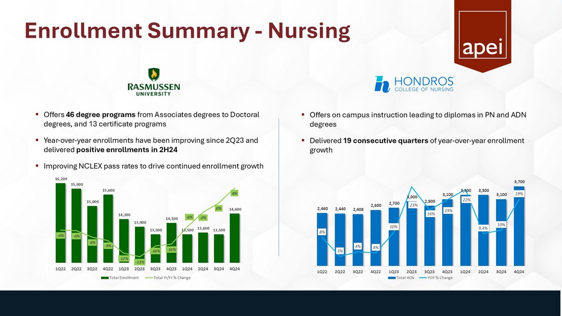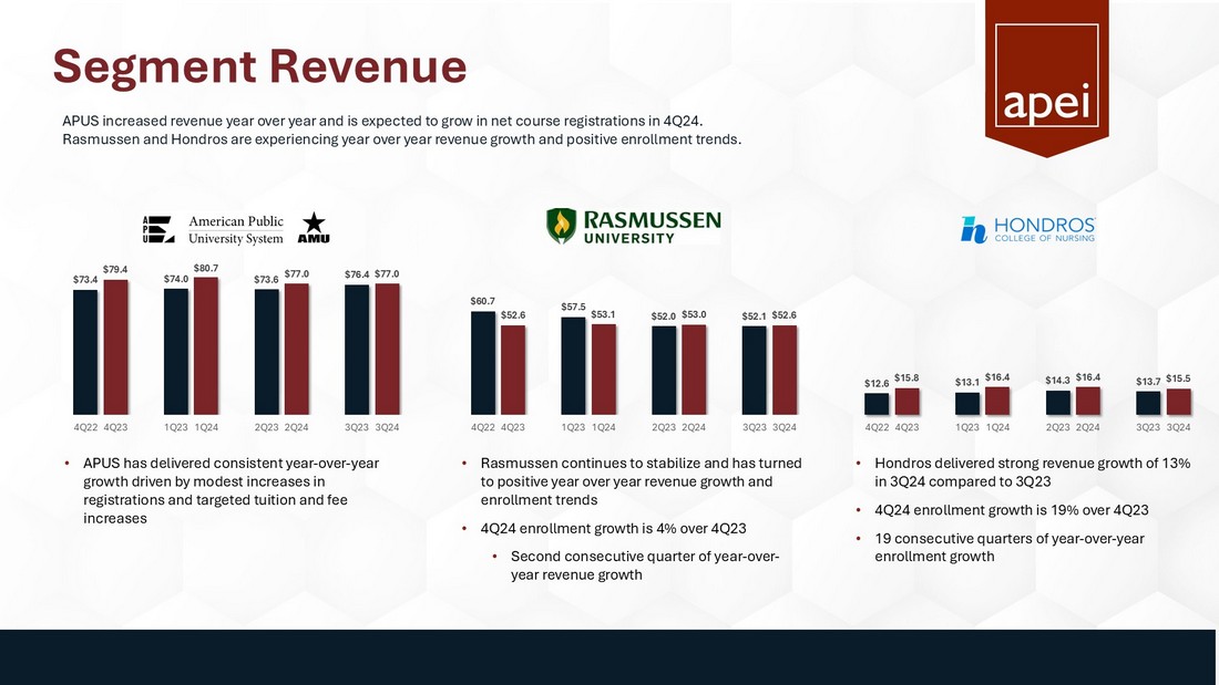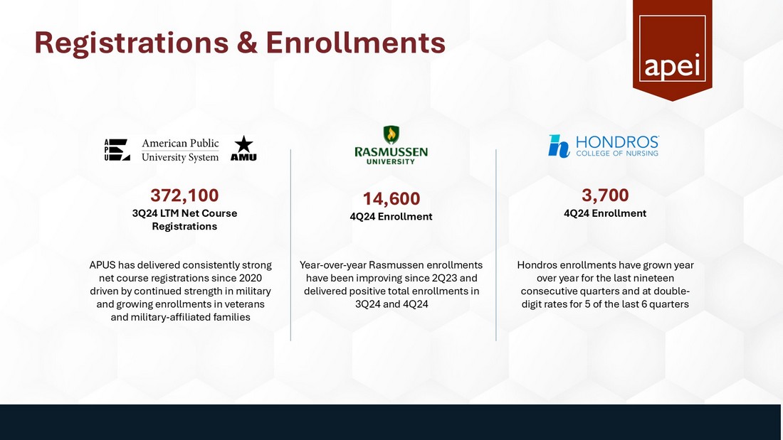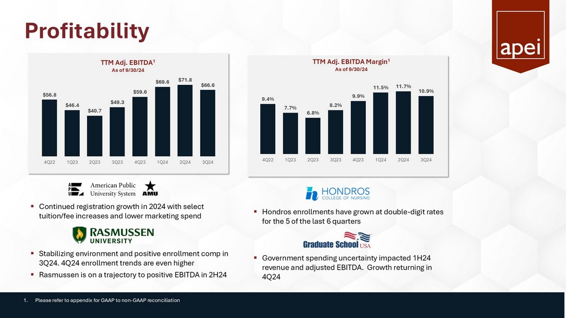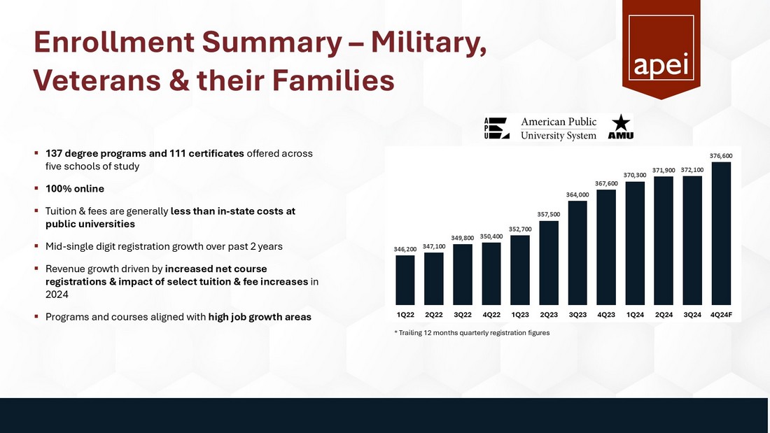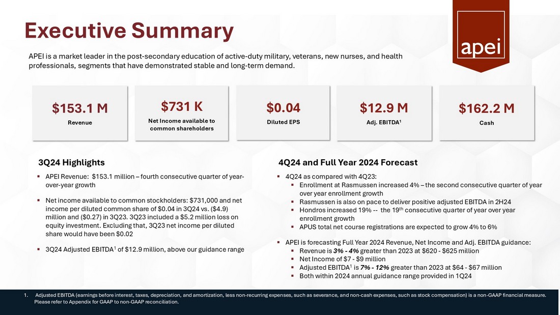 Executive Summary $153.1 M Revenue $12.9 M Adj. EBITDA 1 $731 K Net Income available to common shareholders $162.2 M Cash 1. Adjusted EBITDA (earnings before interest, taxes, depreciation, and amortization, less non - recurring expenses, such as severanc e, and non - cash expenses, such as stock compensation) is a non - GAAP financial measure. Please refer to Appendix for GAAP to non - GAAP reconciliation. $0.04 Diluted EPS ▪ APEI Revenue: $ 153.1 million – fourth consecutive quarter of year - over - year growth ▪ Net income available to common stockholders: $731,000 and net income per diluted common share of $0.04 in 3Q24 vs. ($4.9) million and ($0.27) in 3Q23. 3Q23 included a $5.2 million loss on equity investment. Excluding that, 3Q23 net income per diluted share would have been $0.02 ▪ 3Q24 Adjusted EBITDA 1 of $12.9 million, above our guidance range 3Q24 Highlights 4Q24 and Full Year 2024 Forecast APEI is a market leader in the post - secondary education of active - duty military, veterans, new nurses, and health professionals, segments that have demonstrated stable and long - term demand. ▪ 4Q24 as compared with 4Q23: ▪ Enrollment at Rasmussen increased 4% – the second consecutive quarter of year over year enrollment growth ▪ Rasmussen is also on pace to deliver positive adjusted EBITDA in 2H24 ▪ Hondros increased 19% -- the 19 th consecutive quarter of year over year enrollment growth ▪ APUS total net course registrations are expected to grow 4% to 6% ▪ APEI is forecasting Full Year 2024 Revenue, Net Income and Adj. EBITDA guidance: ▪ Revenue is 3% - 4% greater than 2023 at $620 - $625 million ▪ Net Income of $7 - $9 million ▪ Adjusted EBITDA 1 is 7% - 12% greater than 2023 at $64 - $67 million ▪ Both within 2024 annual guidance range provided in 1Q24