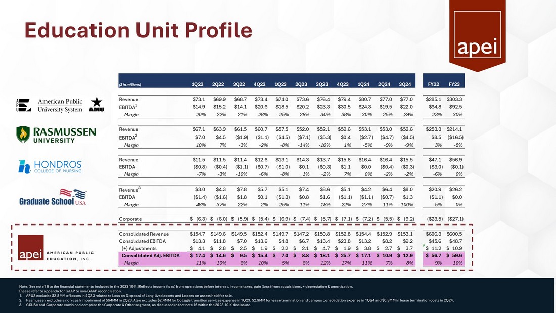 Education Unit Profile Note: See note 16 to the financial statements included in the 2023 10 - K. Reflects income (loss) from operations before interest, income taxes, gain (loss) from acquisitions, + depreciation & amortization. Please refer to appendix for GAAP to non - GAAP reconciliation. 1. APUS excludes $2.8MM of losses in 4Q23 related to Loss on Disposal of Long - lived assets and Losses on assets held for sale. 2. Rasmussen excludes a non - cash impairment of $64MM in 2Q23. Also excludes $2.4MM for Collegis transition services expense in 1Q23, $2.9MM for lease termination and campus consolidation expense in 1Q24 and $0.8MM in leas e termination costs in 2Q24. 3. GSUSA and Corporate combined comprise the Corporate & Other segment, as discussed in footnote 16 within the 2023 10 - K disclosure . ($ in millions) 1Q22 2Q22 3Q22 4Q22 1Q23 2Q23 3Q23 4Q23 1Q24 2Q24 3Q24 FY22 FY23 Revenue $73.1 $69.9 $68.7 $73.4 $74.0 $73.6 $76.4 $79.4 $80.7 $77.0 $77.0 $285.1 $303.3 EBITDA 1 $14.9 $15.2 $14.1 $20.6 $18.5 $20.2 $23.3 $30.5 $24.3 $19.5 $22.0 $64.8 $92.5 Margin 20% 22% 21% 28% 25% 28% 30% 38% 30% 25% 29% 23% 30% Revenue $67.1 $63.9 $61.5 $60.7 $57.5 $52.0 $52.1 $52.6 $53.1 $53.0 $52.6 $253.3 $214.1 EBITDA 2 $7.0 $4.5 ($1.9) ($1.1) ($4.5) ($7.1) ($5.3) $0.4 ($2.7) ($4.7) ($4.5) $8.5 ($16.5) Margin 10% 7% -3% -2% -8% -14% -10% 1% -5% -9% -9% 3% -8% Revenue $11.5 $11.5 $11.4 $12.6 $13.1 $14.3 $13.7 $15.8 $16.4 $16.4 $15.5 $47.1 $56.9 EBITDA ($0.8) ($0.4) ($1.1) ($0.7) ($1.0) $0.1 ($0.3) $1.1 $0.0 ($0.4) ($0.3) ($3.0) ($0.1) Margin -7% -3% -10% -6% -8% 1% -2% 7% 0% -2% -2% -6% 0% Revenue 3 $3.0 $4.3 $7.8 $5.7 $5.1 $7.4 $8.6 $5.1 $4.2 $6.4 $8.0 $20.9 $26.2 EBITDA ($1.4) ($1.6) $1.8 $0.1 ($1.3) $0.8 $1.6 ($1.1) ($1.1) ($0.7) $1.3 ($1.1) $0.0 Margin -48% -37% 22% 2% -25% 11% 18% -22% -27% -11% -100% -5% 0% Corporate (6.3)$ (6.0)$ (5.9)$ (5.4)$ (6.9)$ (7.4)$ (5.7)$ (7.1)$ (7.2)$ (5.5)$ (9.2)$ ($23.5) ($27.1) Consolidated Revenue $154.7 $149.6 $149.5 $152.4 $149.7 $147.2 $150.8 $152.8 $154.4 $152.9 $153.1 $606.3 $600.5 Consolidated EBITDA $13.3 $11.8 $7.0 $13.6 $4.8 $6.7 $13.4 $23.8 $13.2 $8.2 $9.2 $45.6 $48.7 (+) Adjustments 4.1$ 2.8$ 2.5$ 1.9$ 2.2$ 2.1$ 4.7$ 1.9$ 3.8$ 2.7$ 3.7$ 11.2$ 10.9$ Consolidated Adj. EBITDA 17.4$ 14.6$ 9.5$ 15.4$ 7.0$ 8.8$ 18.1$ 25.7$ 17.1$ 10.9$ 12.9$ 56.7$ 59.6$ Margin 11% 10% 6% 10% 5% 6% 12% 17% 11% 7% 8% 9% 10%
