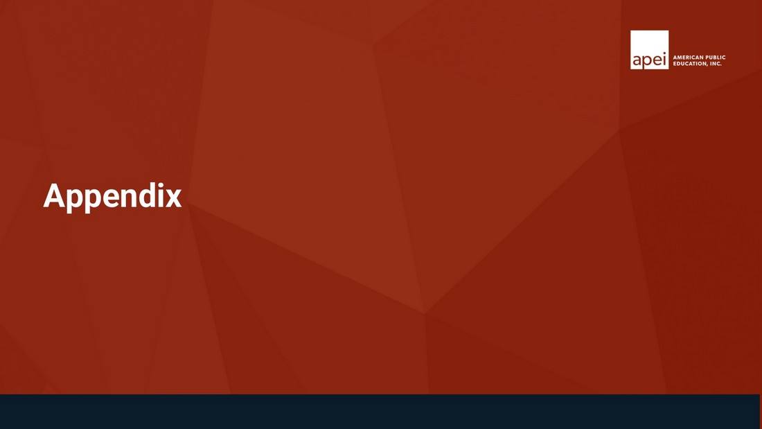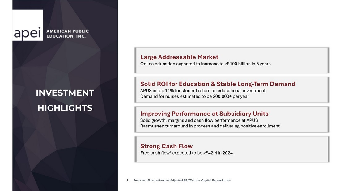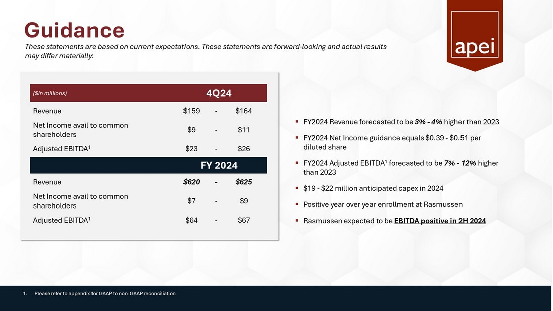 Non - GAAP Disclosures American Public Education is presenting adjusted EBITDA in connection with its GAAP outlook and urges investors to review the reconciliation of projected adjusted net income to the comparable GAAP financial measure that is included in the table below (under the caption “GAAP Outlook Net Income to Outlook Adjusted EBITDA”) and not to rely on any single financial measure to evaluate its business . GAAP Outlook Net Income to Outlook Adjusted EBITDA:   (in thousands, except per share data)         Net income available to common stockholders $ 8,575 $ 10,735 $ 7,127 $ 9,287 Preferred dividends 1,503 1,503 6,100 6,100 Net Income 10,078 12,238 13,227 15,387 Income tax expense 4,425 5,265 6,858 7,698 Interest expense 458 458 1,750 1,750 Loss on minority investment - - 4,408 4,408 Depreciation and amortization 4,860 4,860 20,300 20,300 EBITDA 19,820 22,820 46,542 49,542 Stock compensation 1,898 1,898 7,400 7,400 Other professional fees 1,050 1,050 1,813 1,813 Loss on leases - - 3,950 3,950 Transition services cost 651 651 4,295 4,295 Adjusted EBITDA $ 23,419 $ 26,419 $ 64,000 $ 67,000 December 31, 2024 December 31, 2024 Low High Low High The following table sets forth the reconciliation of the Company’s outlook GAAP net income to the calculation of outlook adjusted EBITDA for the three and twelve months ending December 31, 2024: Three Months Ending Twelve Months Ending
