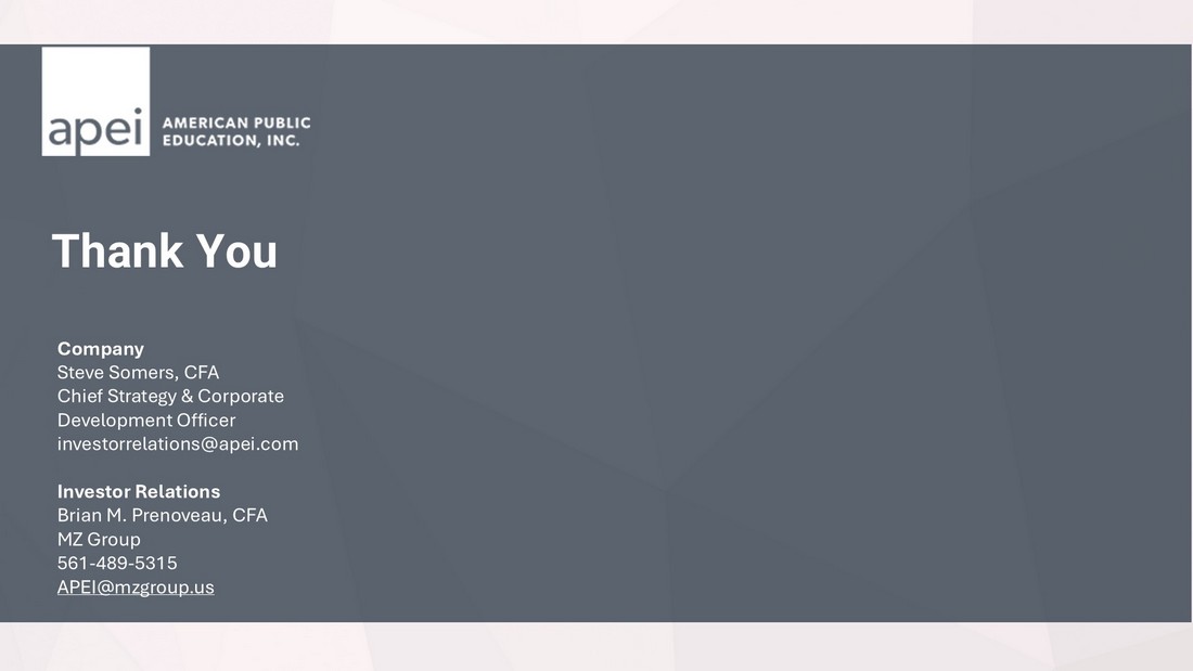 Thank You Company Steve Somers, CFA Chief Strategy & Corporate Development Officer investorrelations@apei.com Investor Relations Brian M. Prenoveau , CFA MZ Group 561 - 489 - 5315 APEI@mzgroup.us