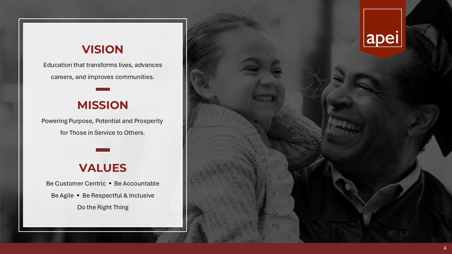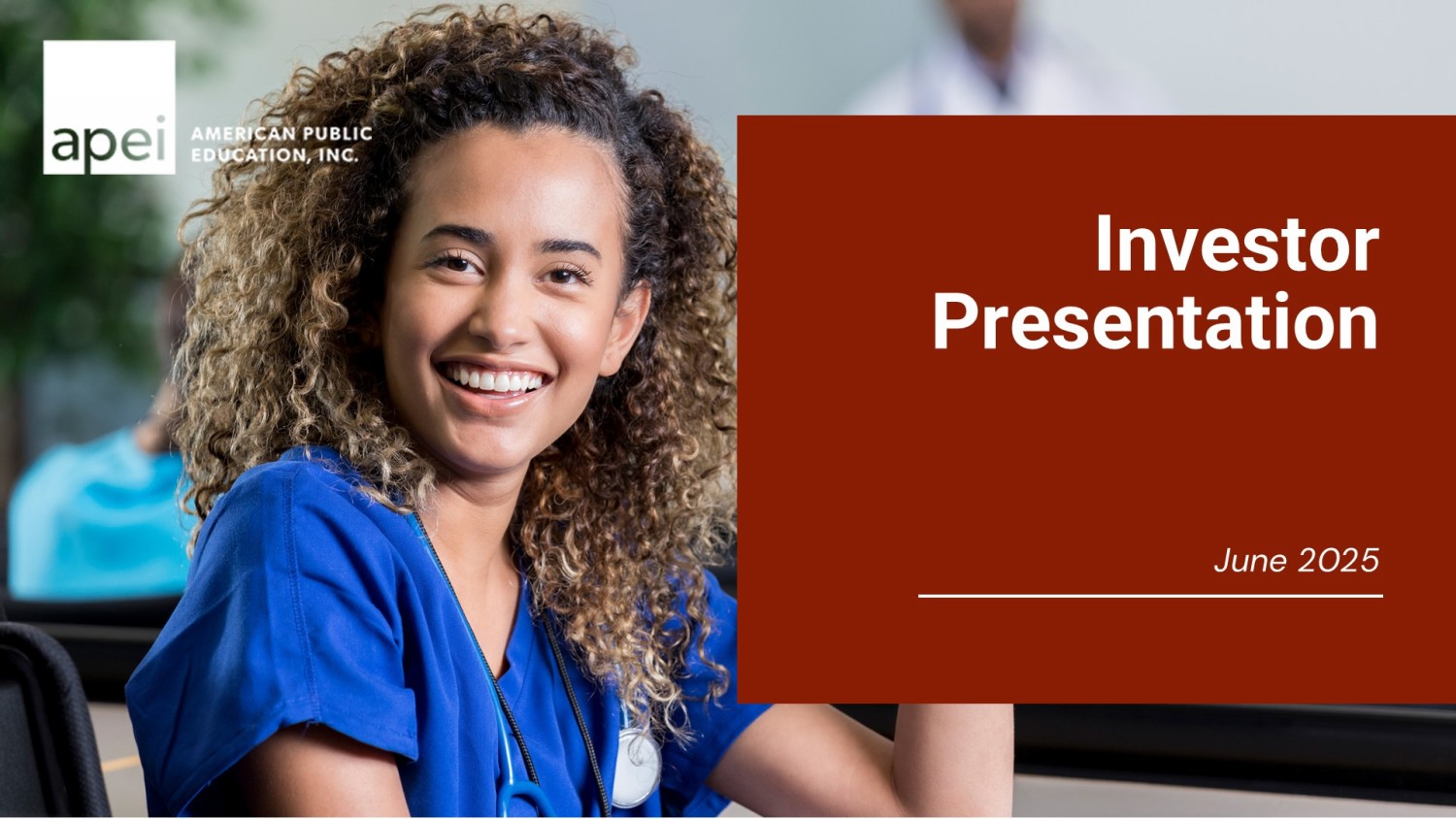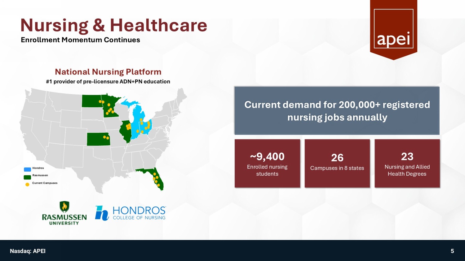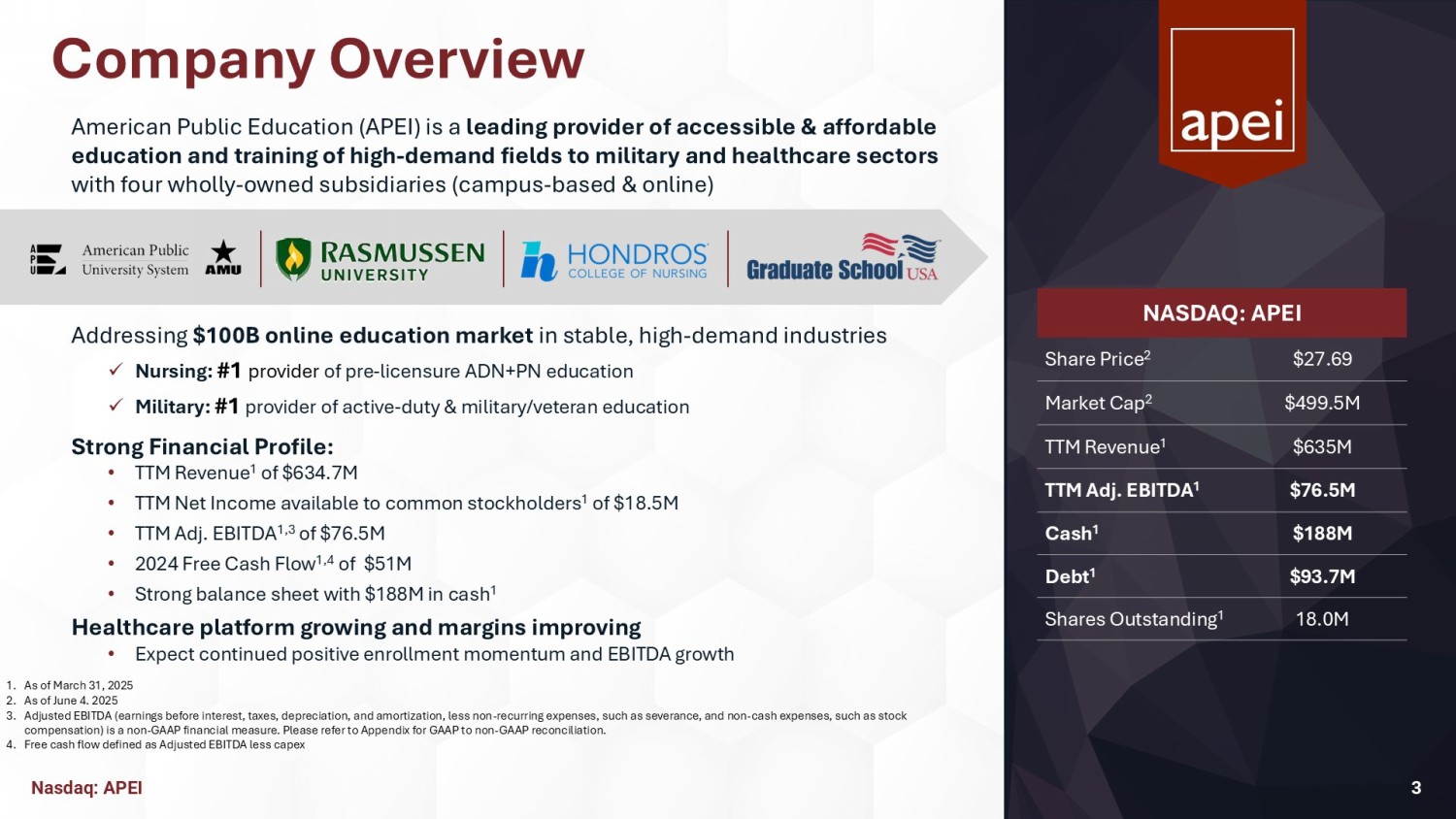 Company Overview American Public Education (APEI) is a leading provider of accessible & affordable education and training of high - demand fields to military and healthcare sectors with four wholly - owned subsidiaries (campus - based & online) Addressing $100B online education market in stable, high - demand industries x Nursing: #1 provider of pre - licensure ADN+PN education x Military: #1 provider of active - duty & military/veteran education Strong Financial Profile: • TTM Revenue 1 of $634.7M • TTM Net Income available to common stockholders 1 of $18.5M • TTM Adj. EBITDA 1,3 of $76.5M • 2024 Free Cash Flow 1,4 of $51M • Strong balance sheet with $188M in cash 1 Healthcare platform growing and margins improving • Expect continued positive enrollment momentum and EBITDA growth Nasdaq: APEI NASDAQ: APEI $27.69 Share Price 2 $499.5M Market Cap 2 $635M TTM Revenue 1 $76.5M TTM Adj. EBITDA 1 $188M Cash 1 $93.7M Debt 1 18.0M Shares Outstanding 1 3 1. As of March 31, 2025 2. As of June 4. 2025 3. Adjusted EBITDA (earnings before interest, taxes, depreciation, and amortization, less non - recurring expenses, such as severance , and non - cash expenses, such as stock compensation) is a non - GAAP financial measure. Please refer to Appendix for GAAP to non - GAAP reconciliation. 4. Free cash flow defined as Adjusted EBITDA less capex