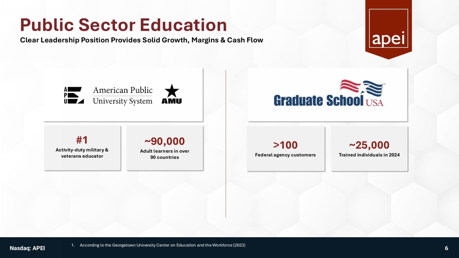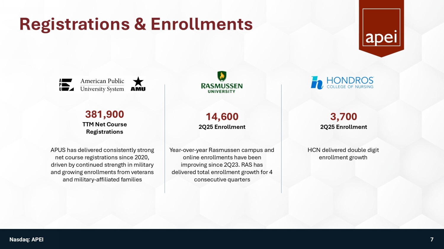 Public Sector Education #1 Activity - duty military & veterans educator ~90,000 Adult learners in over 90 countries >100 Federal agency customers ~25,000 Trained individuals in 2024 Nasdaq: APEI 6 Clear Leadership Position Provides Solid Growth, Margins & Cash Flow 1. According to the Georgetown University Center on Education and the Workforce (2022)
