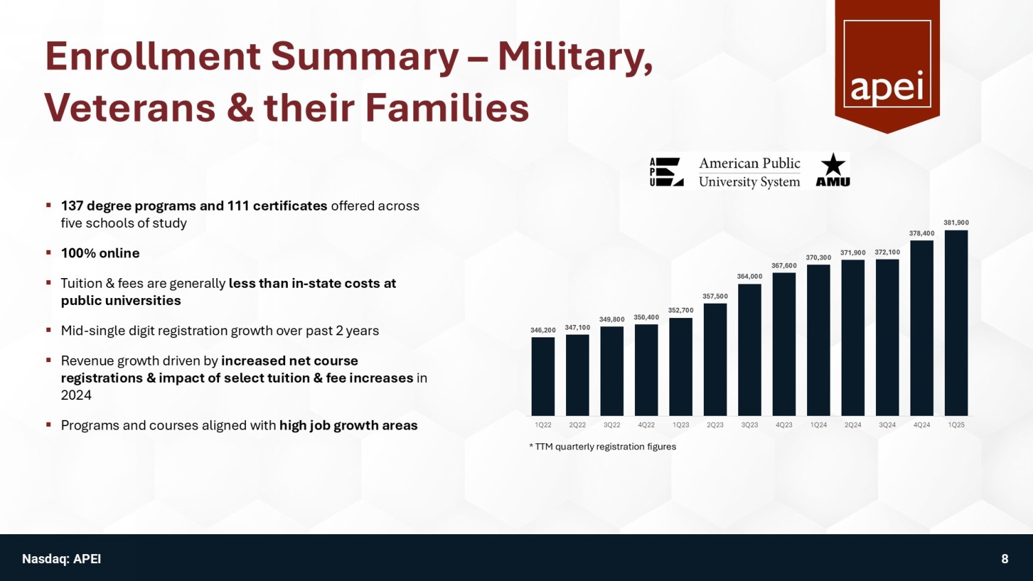 Registrations & Enrollments 381,900 TTM Net Course Registrations 14,600 2Q25 Enrollment APUS has delivered consistently strong net course registrations since 2020, driven by continued strength in military and growing enrollments from veterans and military - affiliated families Year - over - year Rasmussen campus and online enrollments have been improving since 2Q23. RAS has delivered total enrollment growth for 4 consecutive quarters HCN delivered double digit enrollment growth 3,700 2Q25 Enrollment 7 Nasdaq: APEI