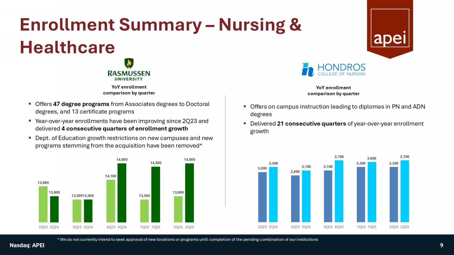 Enrollment Summary – Military, Veterans & their Families * TTM quarterly registration figures 346,200 347,100 349,800 350,400 352,700 357,500 364,000 367,600 370,300 371,900 372,100 378,400 381,900 1Q22 2Q22 3Q22 4Q22 1Q23 2Q23 3Q23 4Q23 1Q24 2Q24 3Q24 4Q24 1Q25 ▪ 137 degree programs and 111 certificates offered across five schools of study ▪ 100% online ▪ Tuition & fees are generally less than in - state costs at public universities ▪ Mid - single digit registration growth over past 2 years ▪ Revenue growth driven by increased net course registrations & impact of select tuition & fee increases in 2024 ▪ Programs and courses aligned with high job growth areas 8 Nasdaq: APEI