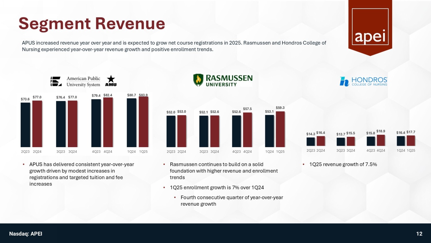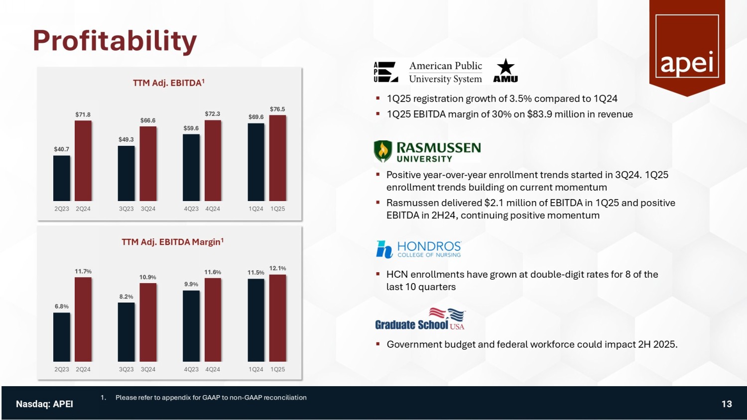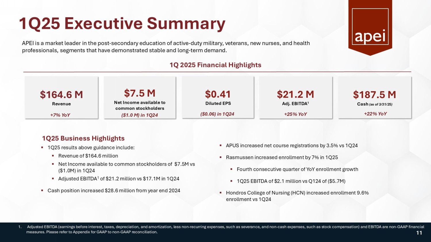 1Q25 Executive Summary $164.6 M Revenue $21.2 M Adj. EBITDA 1 $7.5 M Net Income available to common stockholders $187.5 M Cash (as of 3/31/25) 1. Adjusted EBITDA (earnings before interest, taxes, depreciation, and amortization, less non - recurring expenses, such as severanc e, and non - cash expenses, such as stock compensation) and EBITDA are non - GAAP financial measures. Please refer to Appendix for GAAP to non - GAAP reconciliation. $0.41 Diluted EPS ▪ 1Q25 results above guidance include: ▪ Revenue of $164.6 million ▪ Net Income available to common stockholders of $7.5M vs ($1.0M) in 1Q24 ▪ Adjusted EBITDA 1 of $21.2 million vs $17.1M in 1Q24 ▪ Cash position increased $28.6 million from year end 2024 1Q25 Business Highlights APEI is a market leader in the post - secondary education of active - duty military, veterans, new nurses, and health professionals, segments that have demonstrated stable and long - term demand. 1Q 2025 Financial Highlights +7% YoY +25% YoY +22% YoY ▪ APUS increased net course registrations by 3.5% vs 1Q24 ▪ Rasmussen increased enrollment by 7% in 1Q25 ▪ Fourth consecutive quarter of YoY enrollment growth ▪ 1Q25 EBITDA of $2.1 million vs Q124 of ($5.7M) ▪ Hondros College of Nursing (HCN) increased enrollment 9.6% enrollment vs 1Q24 ($1.0 M) in 1Q24 ($0.06) in 1Q24 11