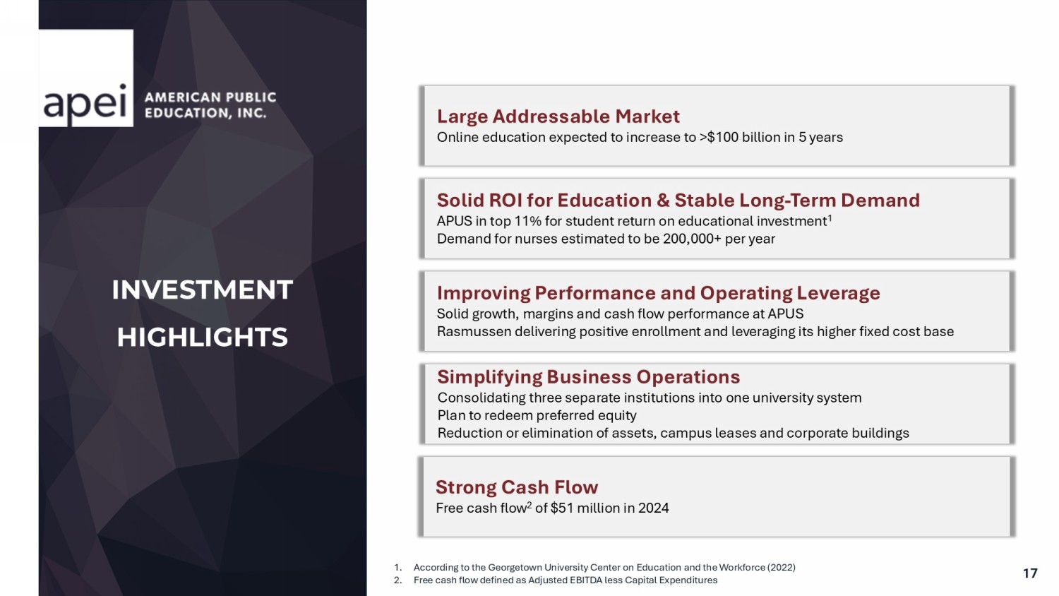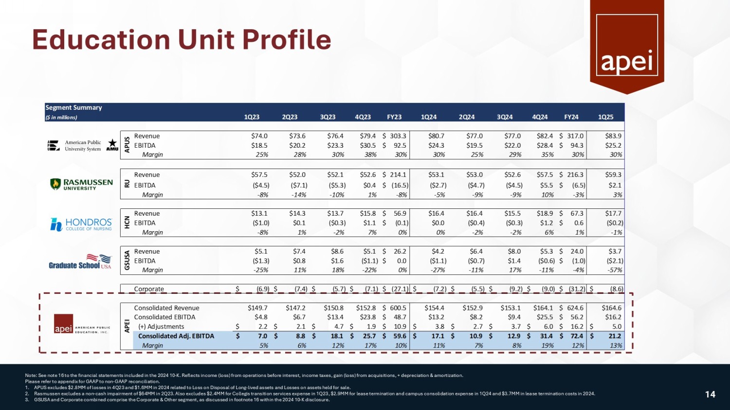 Education Unit Profile Note: See note 16 to the financial statements included in the 2024 10 - K. Reflects income (loss) from operations before interest, income taxes, gain (loss) from acquisitions, + depreciation & amortization. Please refer to appendix for GAAP to non - GAAP reconciliation. 1. APUS excludes $2.8MM of losses in 4Q23 and $1.6MM in 2024 related to Loss on Disposal of Long - lived assets and Losses on assets held for sale. 2. Rasmussen excludes a non - cash impairment of $64MM in 2Q23. Also excludes $2.4MM for Collegis transition services expense in 1Q23, $2.9MM for lease termination and campus consolidation expense in 1Q24 and $3.7MM in leas e termination costs in 2024. 3. GSUSA and Corporate combined comprise the Corporate & Other segment, as discussed in footnote 16 within the 2024 10 - K disclosure . Segment Summary ($ in millions) 1Q23 2Q23 3Q23 4Q23 FY23 1Q24 2Q24 3Q24 4Q24 FY24 1Q25 Revenue $74.0 $73.6 $76.4 $79.4 303.3$ $80.7 $77.0 $77.0 $82.4 317.0$ $83.9 EBITDA $18.5 $20.2 $23.3 $30.5 92.5$ $24.3 $19.5 $22.0 $28.4 94.3$ $25.2 Margin 25% 28% 30% 38% 30% 30% 25% 29% 35% 30% 30% Revenue $57.5 $52.0 $52.1 $52.6 214.1$ $53.1 $53.0 $52.6 $57.5 216.3$ $59.3 EBITDA ($4.5) ($7.1) ($5.3) $0.4 (16.5)$ ($2.7) ($4.7) ($4.5) $5.5 (6.5)$ $2.1 Margin -8% -14% -10% 1% -8% -5% -9% -9% 10% -3% 3% Revenue $13.1 $14.3 $13.7 $15.8 56.9$ $16.4 $16.4 $15.5 $18.9 67.3$ $17.7 EBITDA ($1.0) $0.1 ($0.3) $1.1 (0.1)$ $0.0 ($0.4) ($0.3) $1.2 0.6$ ($0.2) Margin -8% 1% -2% 7% 0% 0% -2% -2% 6% 1% -1% Revenue $5.1 $7.4 $8.6 $5.1 26.2$ $4.2 $6.4 $8.0 $5.3 24.0$ $3.7 EBITDA ($1.3) $0.8 $1.6 ($1.1) 0.0$ ($1.1) ($0.7) $1.4 ($0.6) (1.0)$ ($2.1) Margin -25% 11% 18% -22% 0% -27% -11% 17% -11% -4% -57% Corporate (6.9)$ (7.4)$ (5.7)$ (7.1)$ (27.1)$ (7.2)$ (5.5)$ (9.2)$ (9.0)$ (31.2)$ (8.6)$ Consolidated Revenue $149.7 $147.2 $150.8 $152.8 600.5$ $154.4 $152.9 $153.1 $164.1 624.6$ $164.6 Consolidated EBITDA $4.8 $6.7 $13.4 $23.8 48.7$ $13.2 $8.2 $9.4 $25.5 56.2$ $16.2 (+) Adjustments 2.2$ 2.1$ 4.7$ 1.9$ 10.9$ 3.8$ 2.7$ 3.7$ 6.0$ 16.2$ 5.0$ Consolidated Adj. EBITDA 7.0$ 8.8$ 18.1$ 25.7$ 59.6$ 17.1$ 10.9$ 12.9$ 31.4$ 72.4$ 21.2$ Margin 5% 6% 12% 17% 10% 11% 7% 8% 19% 12% 13% APEI APUS RU HCN GSUSA 14