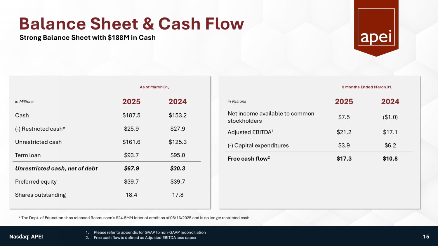 Balance Sheet & Cash Flow 3 Months Ended March 31, 2024 2025 in Millions ($1.0) $7.5 Net income available to common stockholders $17.1 $21.2 Adjusted EBITDA 1 $6.2 $3.9 ( - ) Capital expenditures $10.8 $17.3 Free cash flow 2 As of March 31, 2024 2025 in Millions $153.2 $187.5 Cash $27.9 $25.9 ( - ) Restricted cash* $125.3 $161.6 Unrestricted cash $95.0 $93.7 Term loan $30.3 $67.9 Unrestricted cash, net of debt $39.7 $39.7 Preferred equity 17.8 18.4 Shares outstanding Strong Balance Sheet with $188M in Cash 1. Please refer to appendix for GAAP to non - GAAP reconciliation 2. Free cash flow is defined as Adjusted EBITDA less capex 15 * The Dept. of Educations has released Rasmussen’s $24.5MM letter of credit as of 05/16/2025 and is no longer restricted cash Nasdaq: APEI