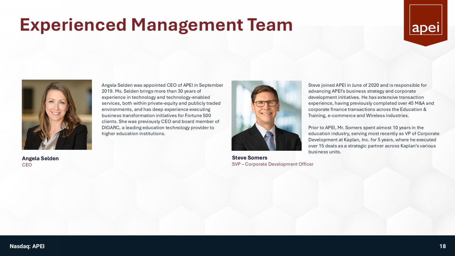 Experienced Management Team Angela Selden CEO Steve Somers SVP – Corporate Development Officer Angela Selden was appointed CEO of APEI in September 2019. Ms. Selden brings more than 30 years of experience in technology and technology - enabled services, both within private - equity and publicly traded environments, and has deep experience executing business transformation initiatives for Fortune 500 clients. She was previously CEO and board member of DIGARC, a leading education technology provider to higher education institutions. Steve joined APEI in June of 2020 and is responsible for advancing APEI’s business strategy and corporate development initiatives. He has extensive transaction experience, having previously completed over 45 M&A and corporate finance transactions across the Education & Training, e - commerce and Wireless industries. Prior to APEI, Mr. Somers spent almost 10 years in the education industry, serving most recently as VP of Corporate Development at Kaplan, Inc. for 5 years, where he executed over 15 deals as a strategic partner across Kaplan’s various business units. Nasdaq: APEI 18