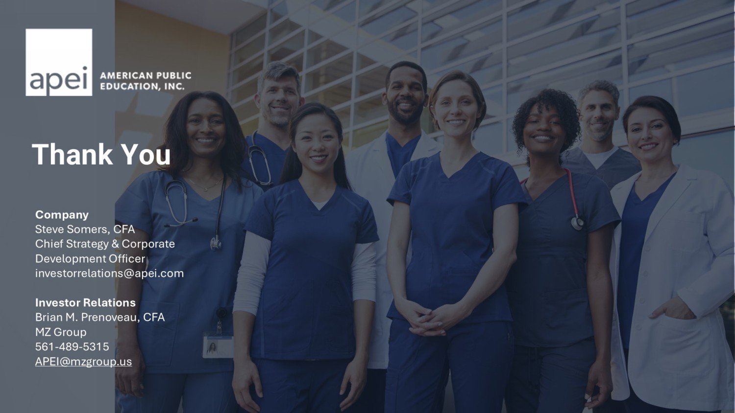 Thank You Company Steve Somers, CFA Chief Strategy & Corporate Development Officer investorrelations@apei.com Investor Relations Brian M. Prenoveau , CFA MZ Group 561 - 489 - 5315 APEI@mzgroup.us
