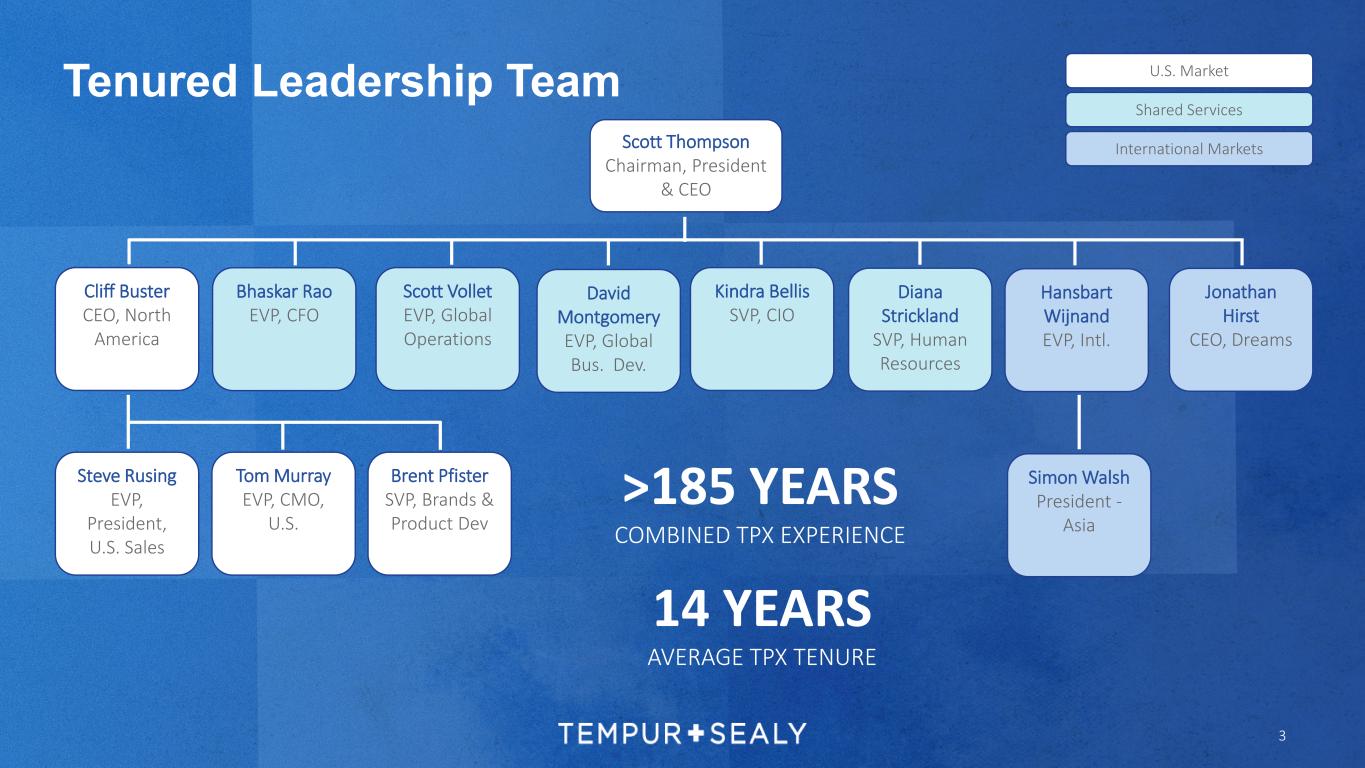 2 History of market share gains across global omnichannel distribution Seasoned, well-aligned management with proven track record Legacy of strong value creation via capital allocation including share buybacks and acquisitions The leading vertically integrated global bedding company with iconic brands and extensive manufacturing capabilities Over the long term, the bedding industry has consistently grown through ASP and unit expansion Investment Thesis