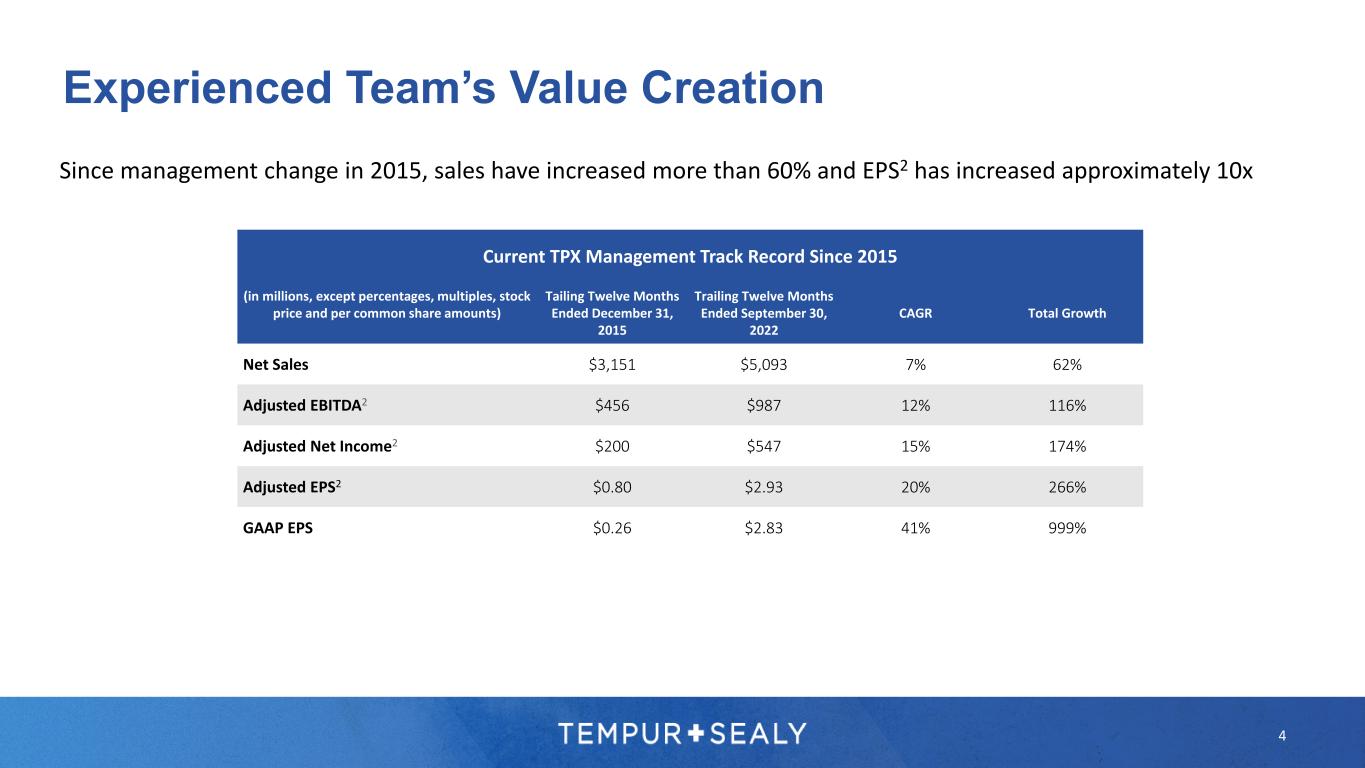 3 U.S. Market International Markets Tenured Leadership Team >185 YEARS COMBINED TPX EXPERIENCE 14 YEARS AVERAGE TPX TENURE Shared Services Scott Thompson Chairman, President & CEO Bhaskar Rao EVP, CFO Cliff Buster CEO, North America Diana Strickland SVP, Human Resources Kindra Bellis SVP, CIO David Montgomery EVP, Global Bus. Dev. Scott Vollet EVP, Global Operations Jonathan Hirst CEO, Dreams Hansbart Wijnand EVP, Intl. Simon Walsh President - Asia Steve Rusing EVP, President, U.S. Sales Brent Pfister SVP, Brands & Product Dev Tom Murray EVP, CMO, U.S.