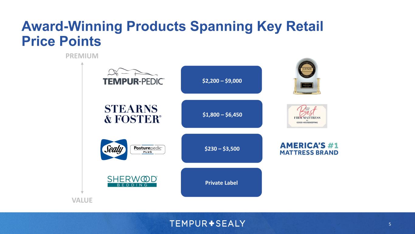4 Current TPX Management Track Record Since 2015 (in millions, except percentages, multiples, stock price and per common share amounts) Tailing Twelve Months Ended December 31, 2015 Trailing Twelve Months Ended September 30, 2022 CAGR Total Growth Net Sales $3,151 $5,093 7% 62% Adjusted EBITDA2 $456 $987 12% 116% Adjusted Net Income2 $200 $547 15% 174% Adjusted EPS2 $0.80 $2.93 20% 266% GAAP EPS $0.26 $2.83 41% 999% Experienced Team’s Value Creation Since management change in 2015, sales have increased more than 60% and EPS2 has increased approximately 10x