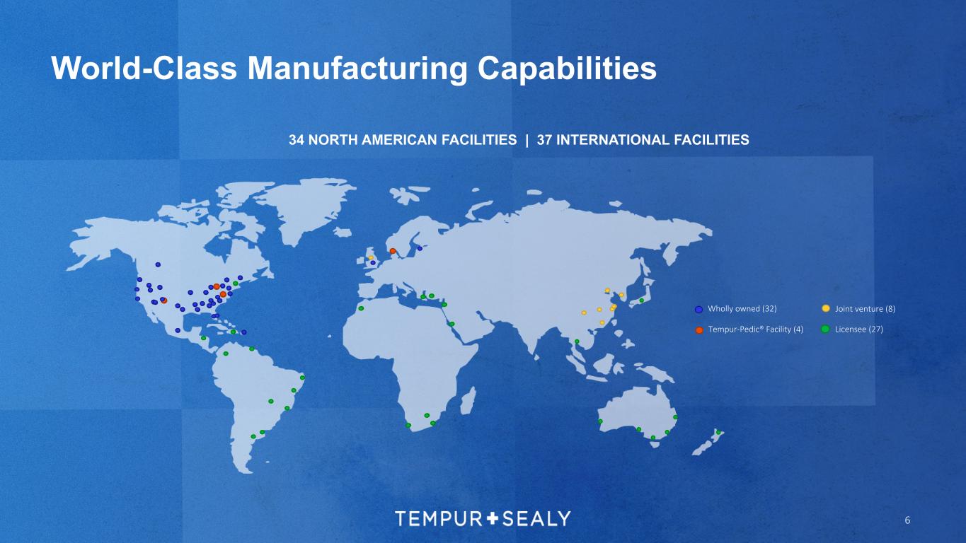 World-Class Manufacturing Capabilities 34 NORTH AMERICAN FACILITIES | 37 INTERNATIONAL FACILITIES 6 Wholly owned (32) Tempur-Pedic® Facility (4) Joint venture (8) Licensee (27)