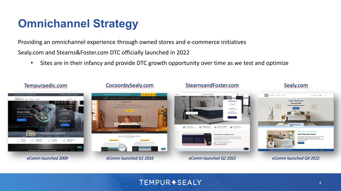 • Significant worldwide sales growth • Highly profitable and expanding rapidly • Direct customer relationships Ecommerce • Luxury Tempur-Pedic®, Dreams, and multi-branded showroom experiences • Operate over 650 stores worldwide and expanding direct customer relationships • Unlocks addressable market, driving incremental profitability Company- Owned Stores • Third-party retailers are our largest distribution channel • Significant private label opportunity • Valued supplier, win-win relationships Wholesale 7 Successful Global Omni Distribution Platform