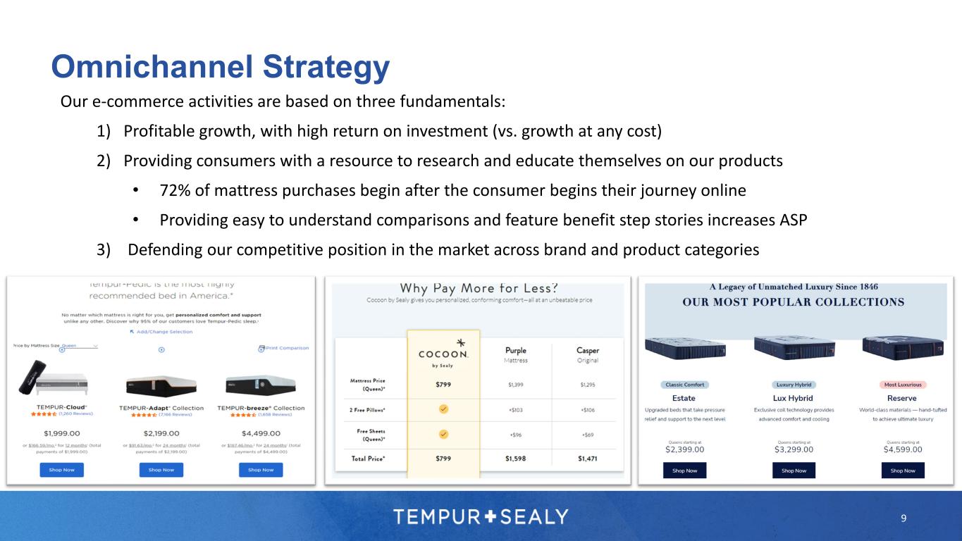 WHAT COMFORT SHOULD BE™ Providing an omnichannel experience through owned stores and e-commerce initiatives Sealy.com and Stearns&Foster.com DTC officially launched in 2022 • Sites are in their infancy and provide DTC growth opportunity over time as we test and optimize Omnichannel Strategy 8