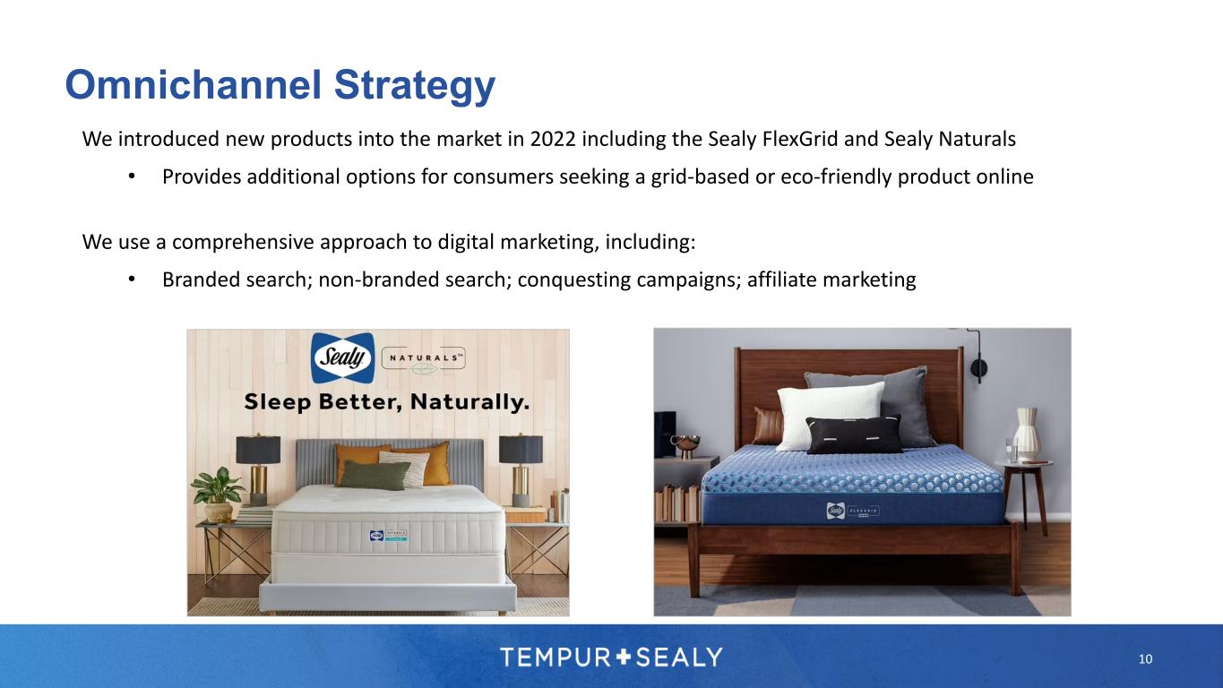 WHAT COMFORT SHOULD BE™ Our e-commerce activities are based on three fundamentals: 1) Profitable growth, with high return on investment (vs. growth at any cost) 2) Providing consumers with a resource to research and educate themselves on our products • 72% of mattress purchases begin after the consumer begins their journey online • Providing easy to understand comparisons and feature benefit step stories increases ASP 3) Defending our competitive position in the market across brand and product categories Omnichannel Strategy 9