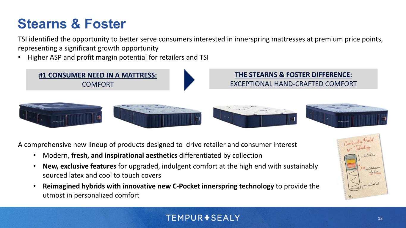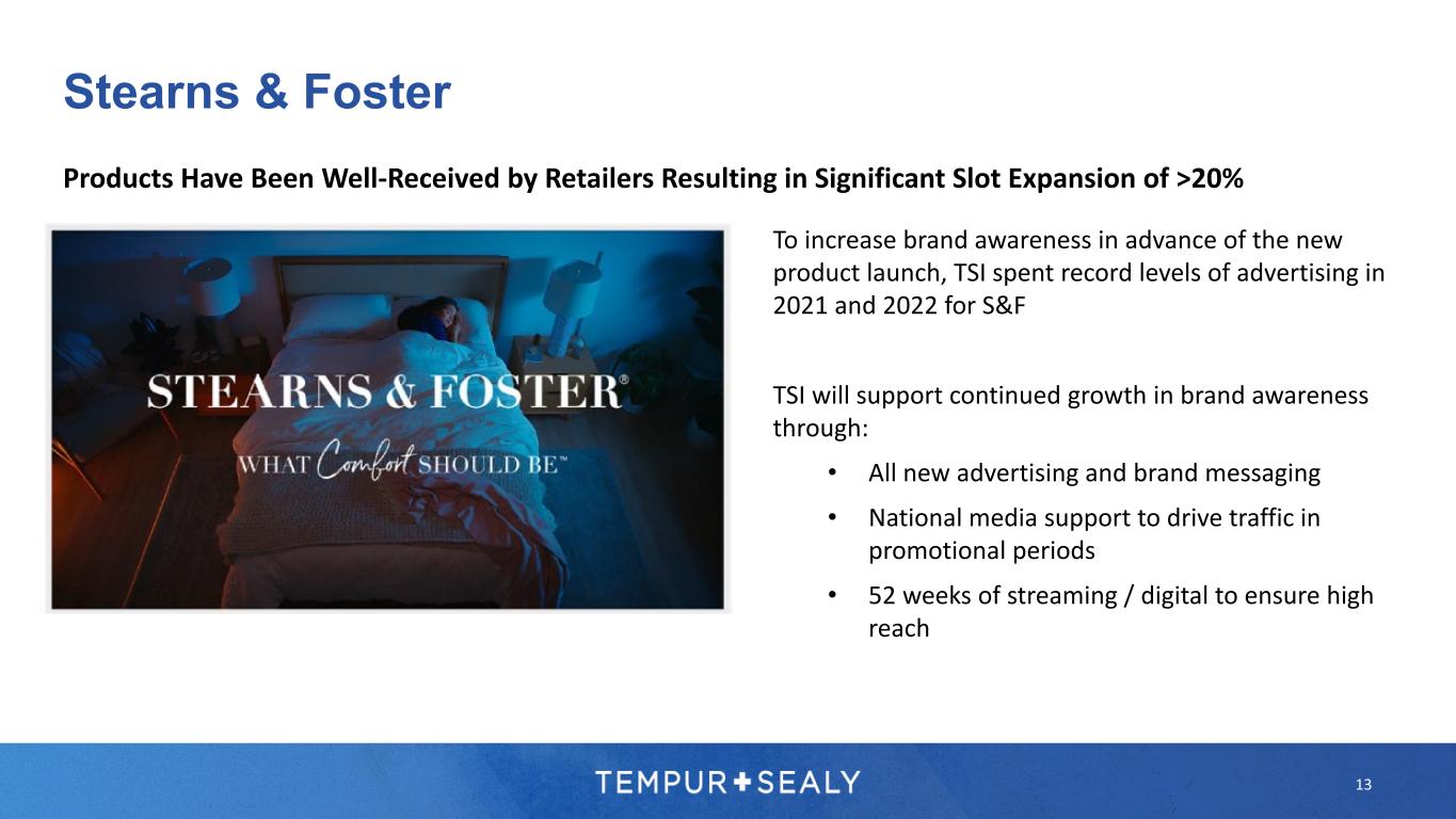 Stearns & Foster 12 A comprehensive new lineup of products designed to drive retailer and consumer interest • Modern, fresh, and inspirational aesthetics differentiated by collection • New, exclusive features for upgraded, indulgent comfort at the high end with sustainably sourced latex and cool to touch covers • Reimagined hybrids with innovative new C-Pocket innerspring technology to provide the utmost in personalized comfort TSI identified the opportunity to better serve consumers interested in innerspring mattresses at premium price points, representing a significant growth opportunity • Higher ASP and profit margin potential for retailers and TSI THE STEARNS & FOSTER DIFFERENCE: EXCEPTIONAL HAND-CRAFTED COMFORT #1 CONSUMER NEED IN A MATTRESS: COMFORT