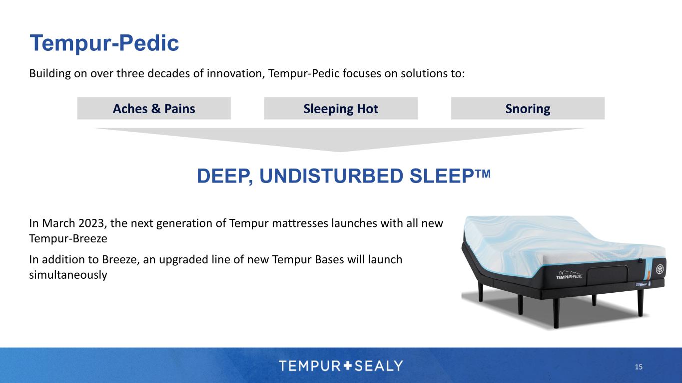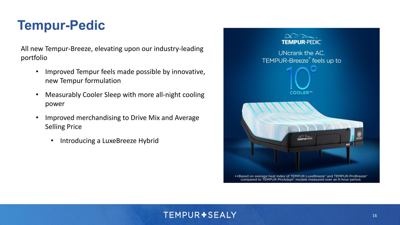 WHAT COMFORT SHOULD BE™ STEARNS & FOSTER® Tempur-Pedic 15 Building on over three decades of innovation, Tempur-Pedic focuses on solutions to: DEEP, UNDISTURBED SLEEPTM Aches & Pains Sleeping Hot Snoring In March 2023, the next generation of Tempur mattresses launches with all new Tempur-Breeze In addition to Breeze, an upgraded line of new Tempur Bases will launch simultaneously