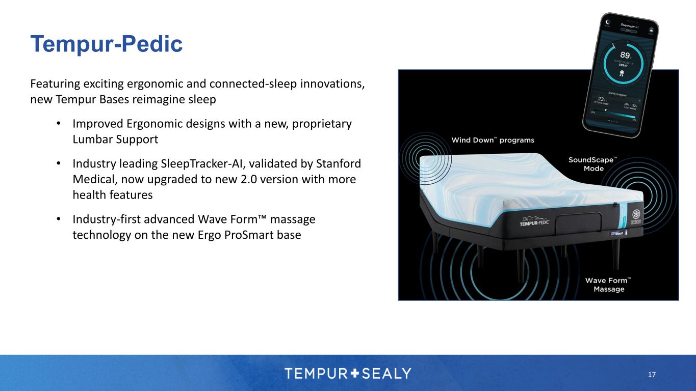 WHAT COMFORT SHOULD BE™ Tempur-Pedic 16 All new Tempur-Breeze, elevating upon our industry-leading portfolio • Improved Tempur feels made possible by innovative, new Tempur formulation • Measurably Cooler Sleep with more all-night cooling power • Improved merchandising to Drive Mix and Average Selling Price • Introducing a LuxeBreeze Hybrid