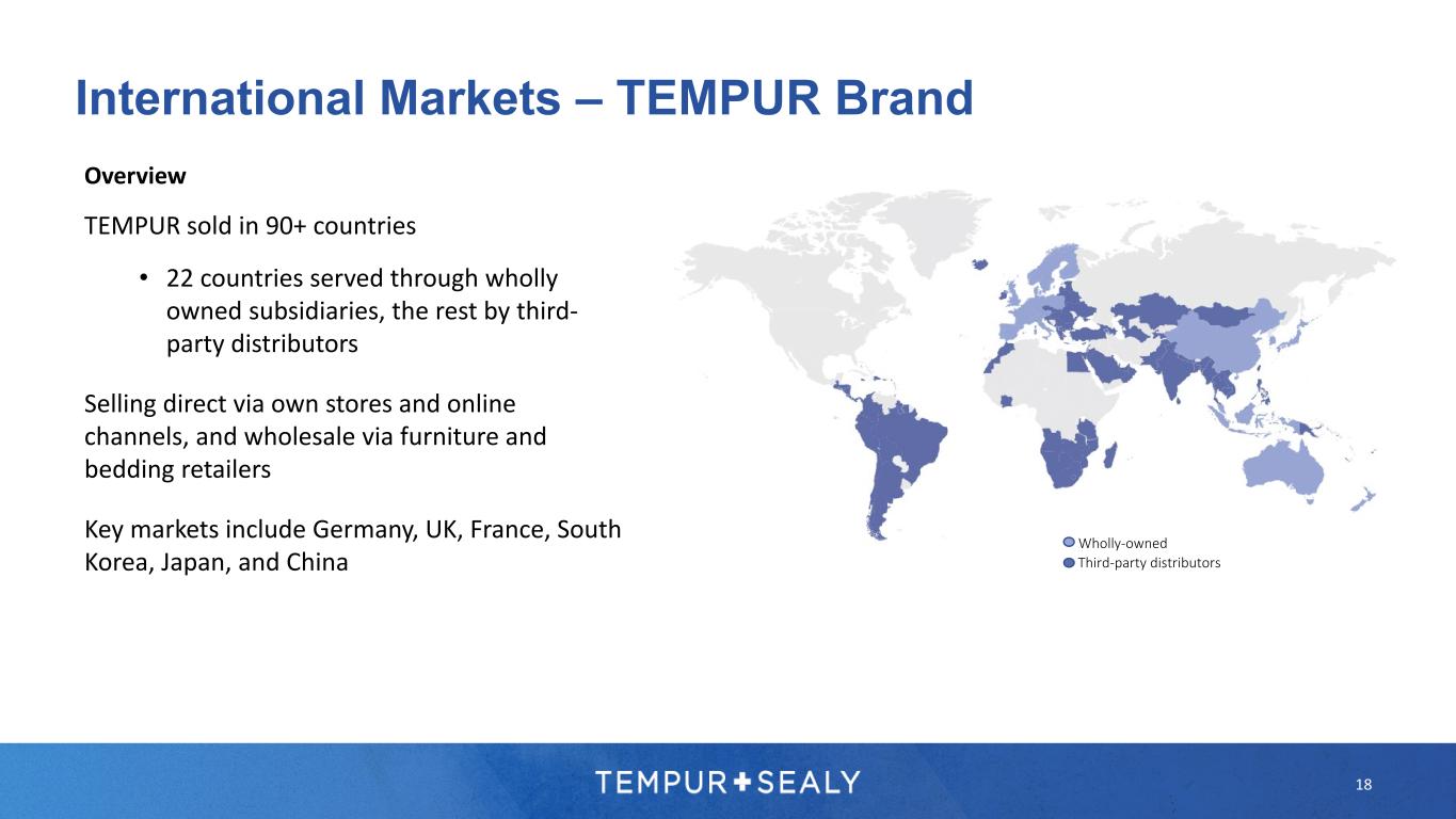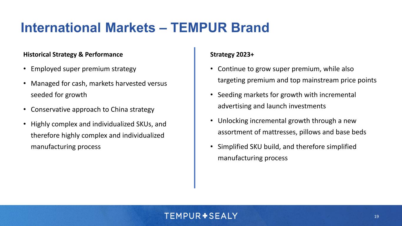 18 International Markets – TEMPUR Brand Overview TEMPUR sold in 90+ countries • 22 countries served through wholly owned subsidiaries, the rest by third- party distributors Selling direct via own stores and online channels, and wholesale via furniture and bedding retailers Key markets include Germany, UK, France, South Korea, Japan, and China Wholly-owned Third-party distributors