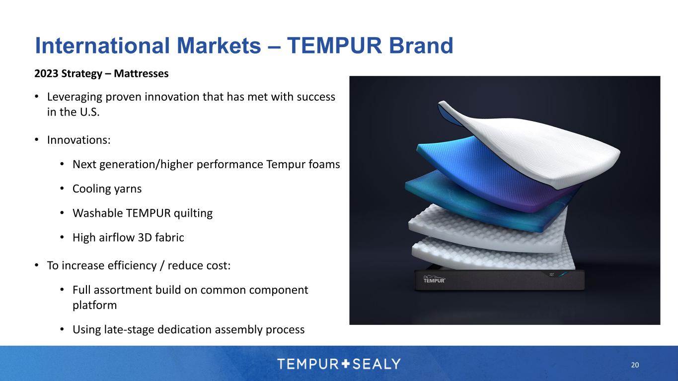 19 International Markets – TEMPUR Brand Historical Strategy & Performance • Employed super premium strategy • Managed for cash, markets harvested versus seeded for growth • Conservative approach to China strategy • Highly complex and individualized SKUs, and therefore highly complex and individualized manufacturing process Strategy 2023+ • Continue to grow super premium, while also targeting premium and top mainstream price points • Seeding markets for growth with incremental advertising and launch investments • Unlocking incremental growth through a new assortment of mattresses, pillows and base beds • Simplified SKU build, and therefore simplified manufacturing process