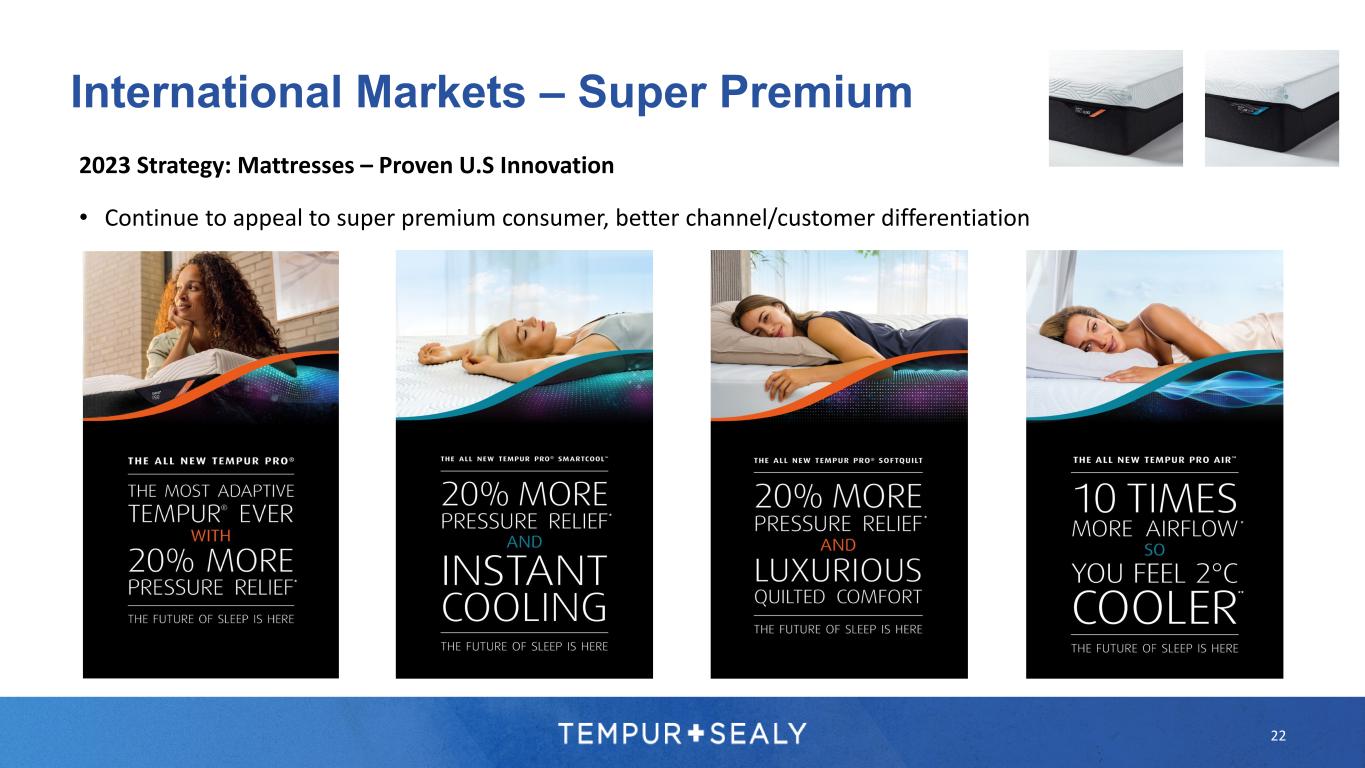 22 International Markets – Super Premium 2023 Strategy: Mattresses – Proven U.S Innovation • Continue to appeal to super premium consumer, better channel/customer differentiation