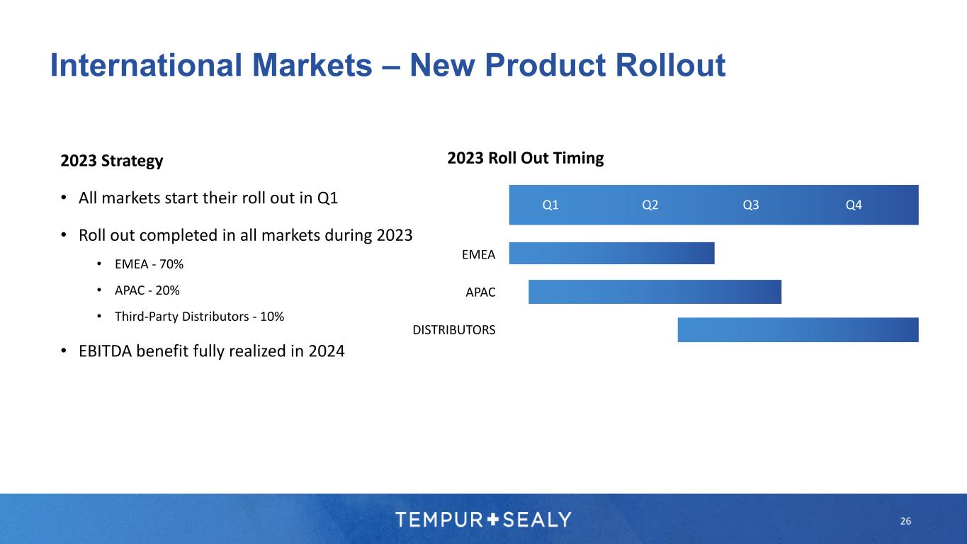 25 International Markets – New Bed Bases 2023 Strategy • Continue to grow super premium, while also targeting new distribution/consumers in premium/top mainstream price points TEMPUR ONE™/EASE™ TEMPUR ARC™