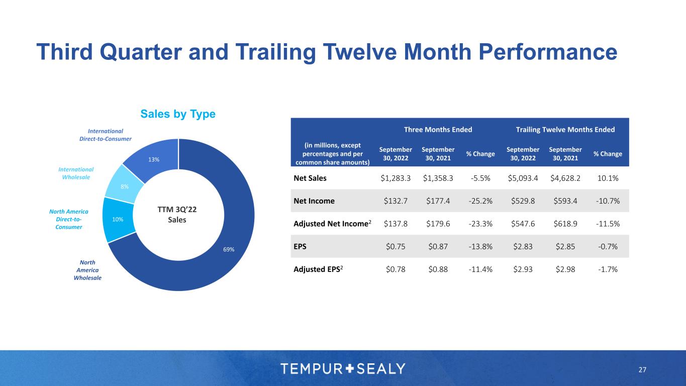 Three Months Ended Trailing Twelve Months Ended (in millions, except percentages and per common share amounts) September 30, 2022 September 30, 2021 % Change September 30, 2022 September 30, 2021 % Change Net Sales $1,283.3 $1,358.3 -5.5% $5,093.4 $4,628.2 10.1% Net Income $132.7 $177.4 -25.2% $529.8 $593.4 -10.7% Adjusted Net Income2 $137.8 $179.6 -23.3% $547.6 $618.9 -11.5% EPS $0.75 $0.87 -13.8% $2.83 $2.85 -0.7% Adjusted EPS2 $0.78 $0.88 -11.4% $2.93 $2.98 -1.7% Third Quarter and Trailing Twelve Month Performance Sales by Type 69% 10% 8% 13% TTM 3Q’22 Sales North America Wholesale North America Direct-to- Consumer International Wholesale International Direct-to-Consumer 27