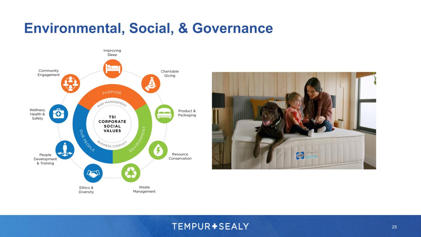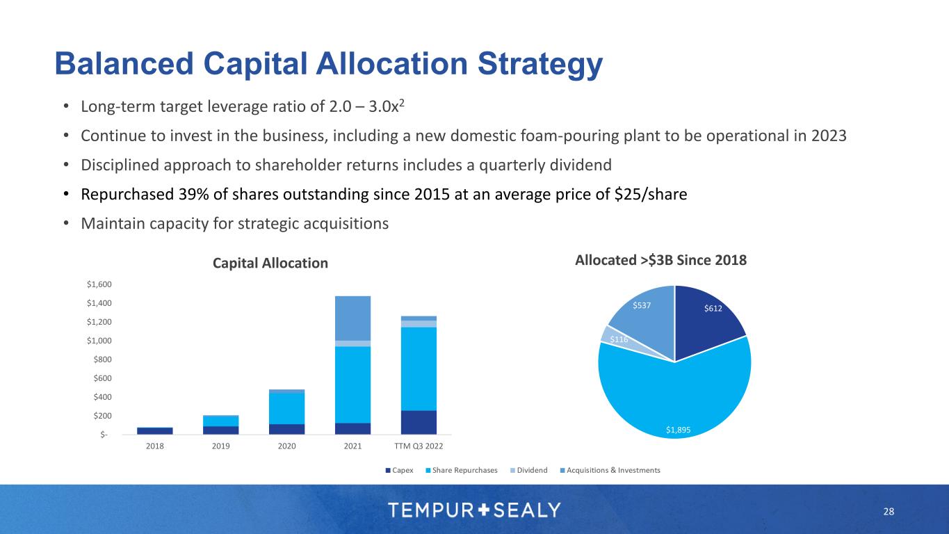 • Long-term target leverage ratio of 2.0 – 3.0x2 • Continue to invest in the business, including a new domestic foam-pouring plant to be operational in 2023 • Disciplined approach to shareholder returns includes a quarterly dividend • Repurchased 39% of shares outstanding since 2015 at an average price of $25/share • Maintain capacity for strategic acquisitions $- $200 $400 $600 $800 $1,000 $1,200 $1,400 $1,600 2018 2019 2020 2021 TTM Q3 2022 Capital Allocation $612 $1,895 $116 $537 Allocated >$3B Since 2018 28 Balanced Capital Allocation Strategy