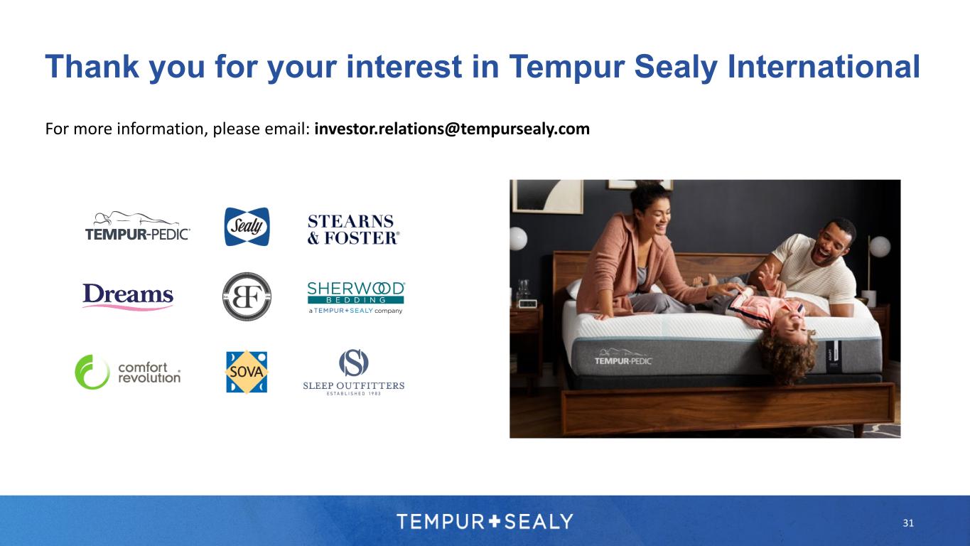 For more information, please email: investor.relations@tempursealy.com 31 Thank you for your interest in Tempur Sealy International