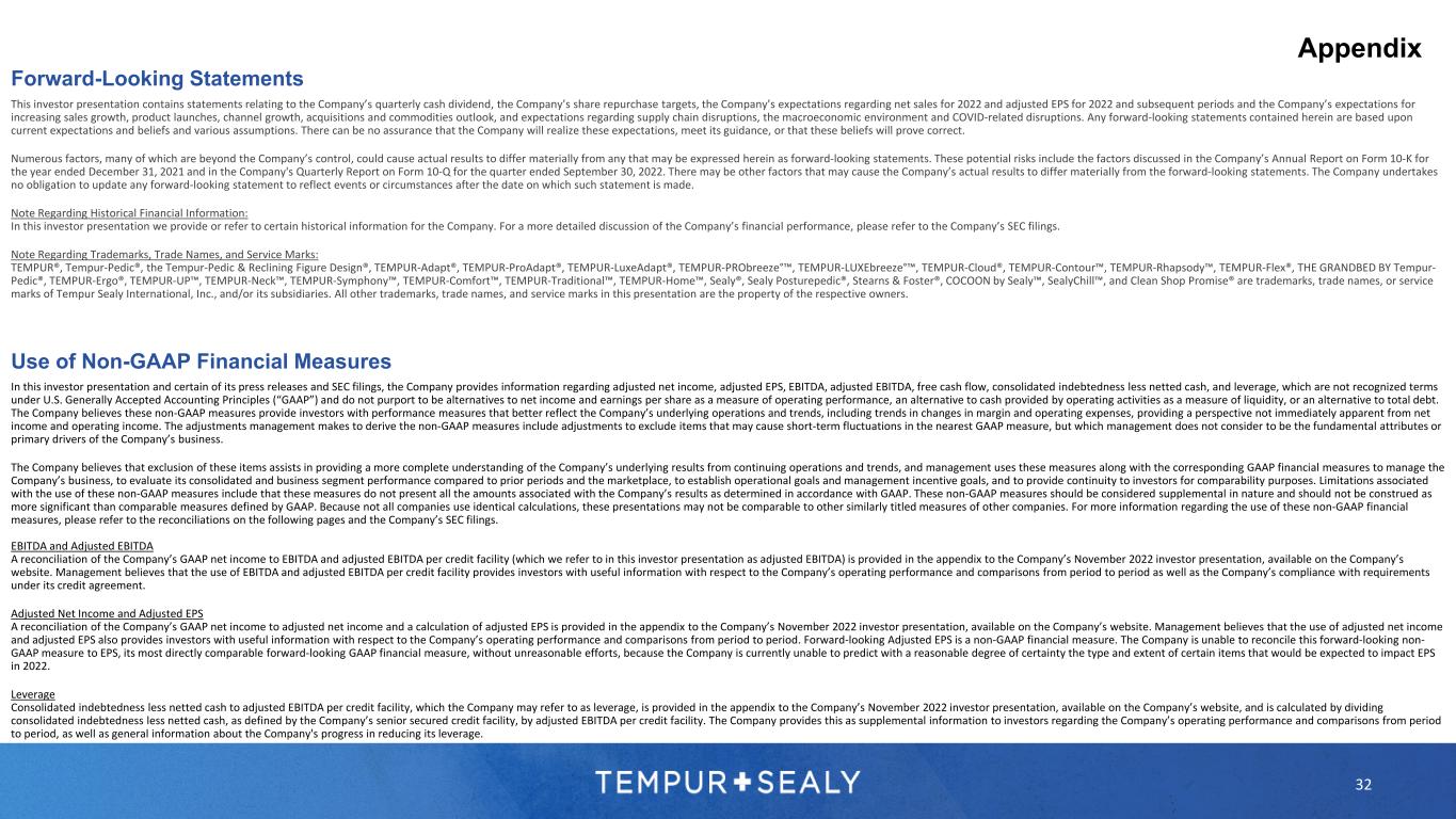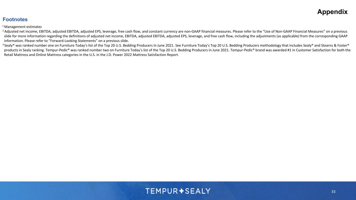 33 1 Management estimates 2 Adjusted net income, EBITDA, adjusted EBITDA, adjusted EPS, leverage, free cash flow, and constant currency are non-GAAP financial measures. Please refer to the “Use of Non-GAAP Financial Measures” on a previous slide for more information regarding the definitions of adjusted net income, EBITDA, adjusted EBITDA, adjusted EPS, leverage, and free cash flow, including the adjustments (as applicable) from the corresponding GAAP information. Please refer to “Forward-Looking Statements” on a previous slide. 3 Sealy® was ranked number one on Furniture Today’s list of the Top 20 U.S. Bedding Producers in June 2021. See Furniture Today’s Top 20 U.S. Bedding Producers methodology that includes Sealy® and Stearns & Foster® products in Sealy ranking. Tempur-Pedic® was ranked number two on Furniture Today’s list of the Top 20 U.S. Bedding Producers in June 2021. Tempur-Pedic® brand was awarded #1 in Customer Satisfaction for both the Retail Mattress and Online Mattress categories in the U.S. in the J.D. Power 2022 Mattress Satisfaction Report. Footnotes Appendix