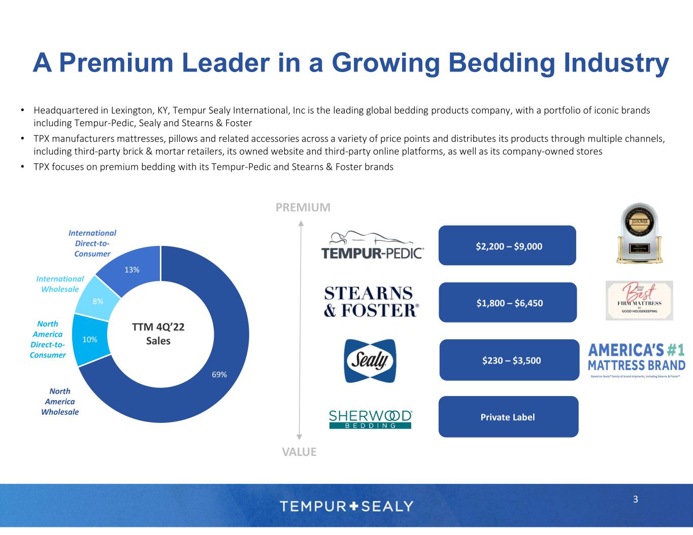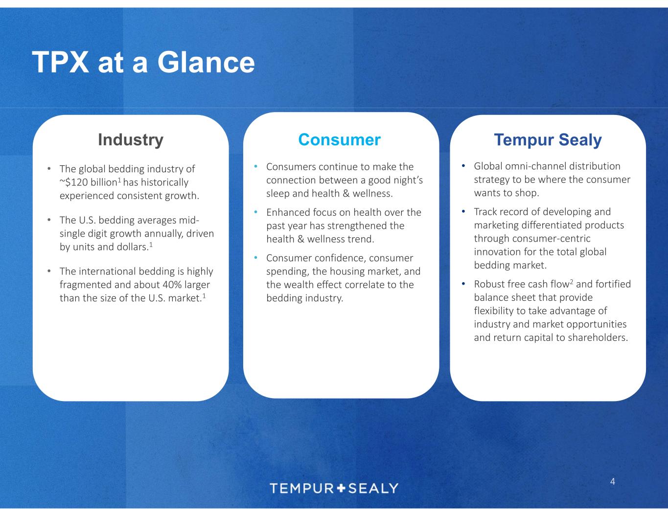 69% 10% 8% 13% TTM 4Q’22 Sales North America Wholesale North America Direct-to- Consumer International Wholesale International Direct-to- Consumer • Headquartered in Lexington, KY, Tempur Sealy International, Inc is the leading global bedding products company, with a portfolio of iconic brands including Tempur-Pedic, Sealy and Stearns & Foster • TPX manufacturers mattresses, pillows and related accessories across a variety of price points and distributes its products through multiple channels, including third-party brick & mortar retailers, its owned website and third-party online platforms, as well as its company-owned stores • TPX focuses on premium bedding with its Tempur-Pedic and Stearns & Foster brands A Premium Leader in a Growing Bedding Industry VALUE PREMIUM $1,800 – $6,450 $2,200 – $9,000 $230 – $3,500 Private Label 3