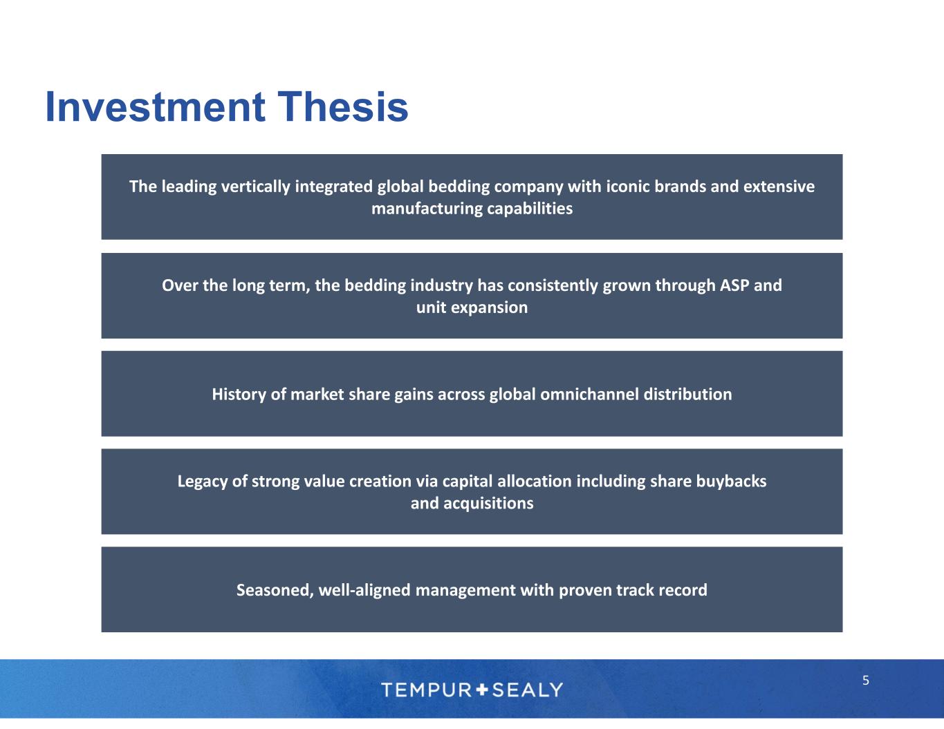 Industry • The global bedding industry of ~$120 billion1 has historically experienced consistent growth. • The U.S. bedding averages mid- single digit growth annually, driven by units and dollars.1 • The international bedding is highly fragmented and about 40% larger than the size of the U.S. market.1 Consumer • Consumers continue to make the connection between a good night’s sleep and health & wellness. • Enhanced focus on health over the past year has strengthened the health & wellness trend. • Consumer confidence, consumer spending, the housing market, and the wealth effect correlate to the bedding industry. Tempur Sealy • Global omni-channel distribution strategy to be where the consumer wants to shop. • Track record of developing and marketing differentiated products through consumer-centric innovation for the total global bedding market. • Robust free cash flow2 and fortified balance sheet that provide flexibility to take advantage of industry and market opportunities and return capital to shareholders. TPX at a Glance 4