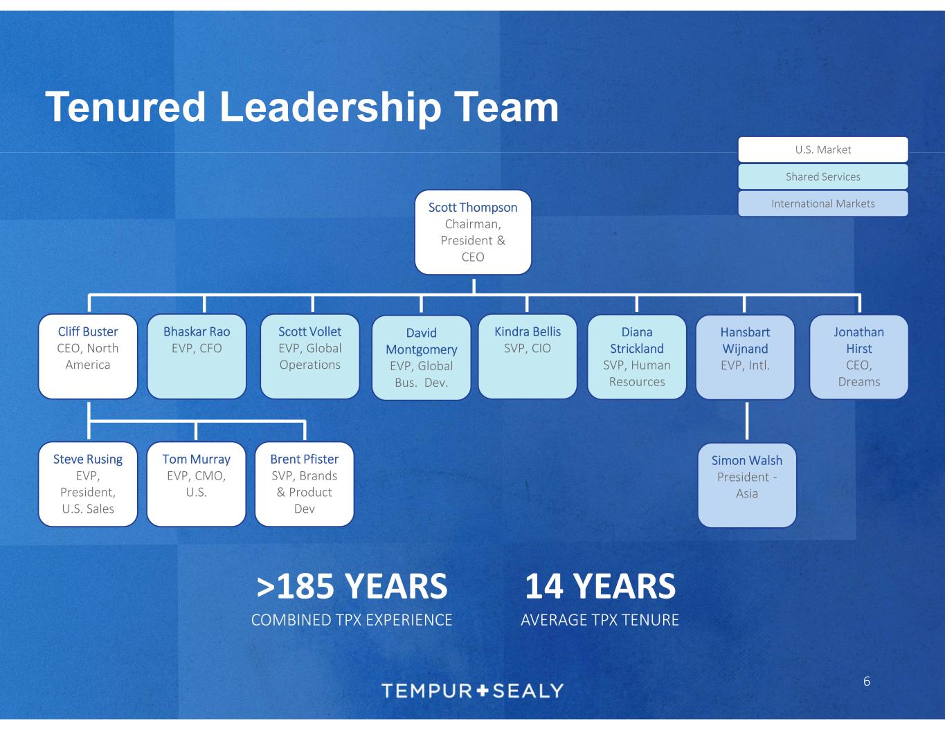 Investment Thesis 5 The leading vertically integrated global bedding company with iconic brands and extensive manufacturing capabilities History of market share gains across global omnichannel distribution Seasoned, well-aligned management with proven track record Legacy of strong value creation via capital allocation including share buybacks and acquisitions Over the long term, the bedding industry has consistently grown through ASP and unit expansion