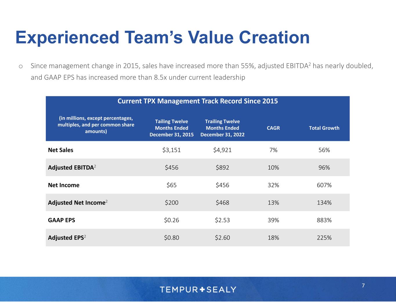 6 U.S. Market International Markets >185 YEARS COMBINED TPX EXPERIENCE 14 YEARS AVERAGE TPX TENURE Shared Services Scott Thompson Chairman, President & CEO Bhaskar Rao EVP, CFO Cliff Buster CEO, North America Diana Strickland SVP, Human Resources Kindra Bellis SVP, CIO David Montgomery EVP, Global Bus. Dev. Scott Vollet EVP, Global Operations Jonathan Hirst CEO, Dreams Hansbart Wijnand EVP, Intl. Simon Walsh President - Asia Steve Rusing EVP, President, U.S. Sales Brent Pfister SVP, Brands & Product Dev Tom Murray EVP, CMO, U.S. Tenured Leadership Team