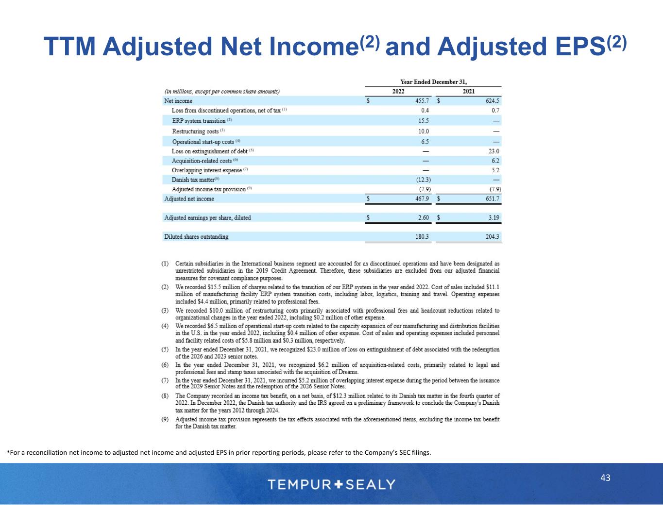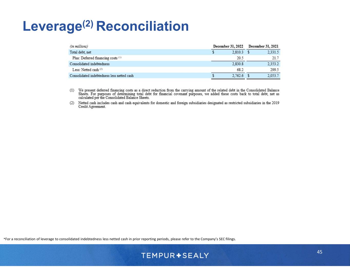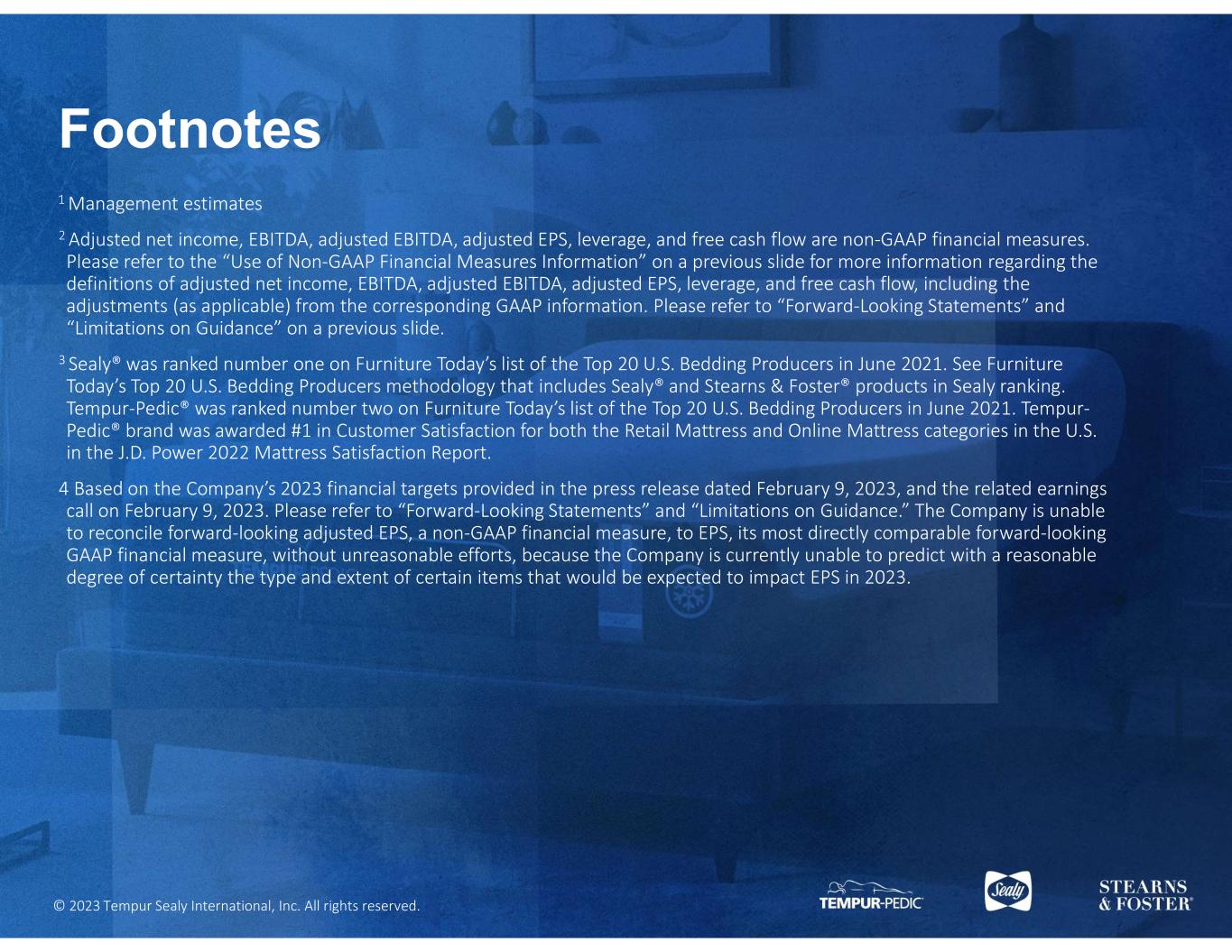 © 2023 Tempur Sealy International, Inc. All rights reserved. 1 Management estimates 2 Adjusted net income, EBITDA, adjusted EBITDA, adjusted EPS, leverage, and free cash flow are non-GAAP financial measures. Please refer to the “Use of Non-GAAP Financial Measures Information” on a previous slide for more information regarding the definitions of adjusted net income, EBITDA, adjusted EBITDA, adjusted EPS, leverage, and free cash flow, including the adjustments (as applicable) from the corresponding GAAP information. Please refer to “Forward-Looking Statements” and “Limitations on Guidance” on a previous slide. 3 Sealy® was ranked number one on Furniture Today’s list of the Top 20 U.S. Bedding Producers in June 2021. See Furniture Today’s Top 20 U.S. Bedding Producers methodology that includes Sealy® and Stearns & Foster® products in Sealy ranking. Tempur-Pedic® was ranked number two on Furniture Today’s list of the Top 20 U.S. Bedding Producers in June 2021. Tempur- Pedic® brand was awarded #1 in Customer Satisfaction for both the Retail Mattress and Online Mattress categories in the U.S. in the J.D. Power 2022 Mattress Satisfaction Report. 4 Based on the Company’s 2023 financial targets provided in the press release dated February 9, 2023, and the related earnings call on February 9, 2023. Please refer to “Forward-Looking Statements” and “Limitations on Guidance.” The Company is unable to reconcile forward-looking adjusted EPS, a non-GAAP financial measure, to EPS, its most directly comparable forward-looking GAAP financial measure, without unreasonable efforts, because the Company is currently unable to predict with a reasonable degree of certainty the type and extent of certain items that would be expected to impact EPS in 2023. Footnotes