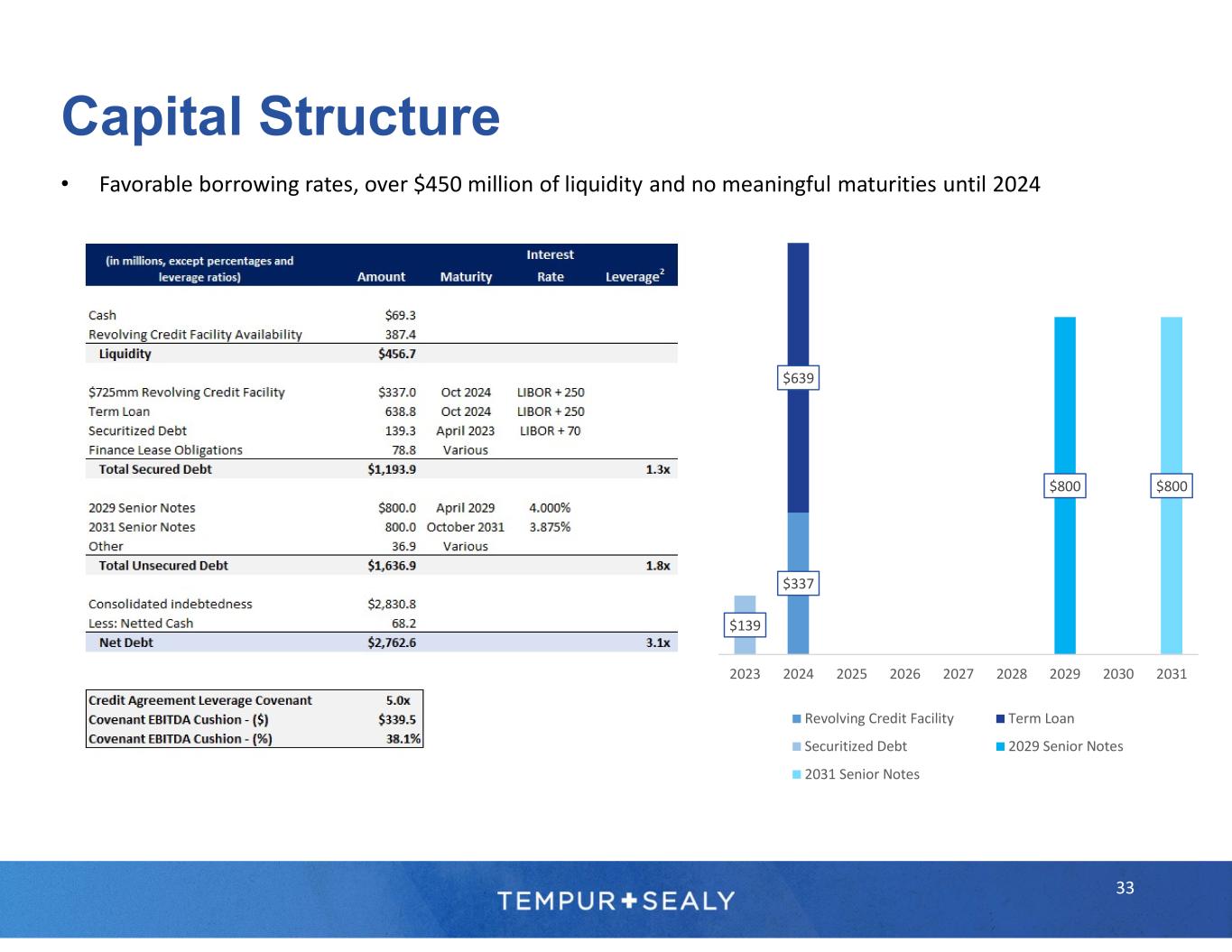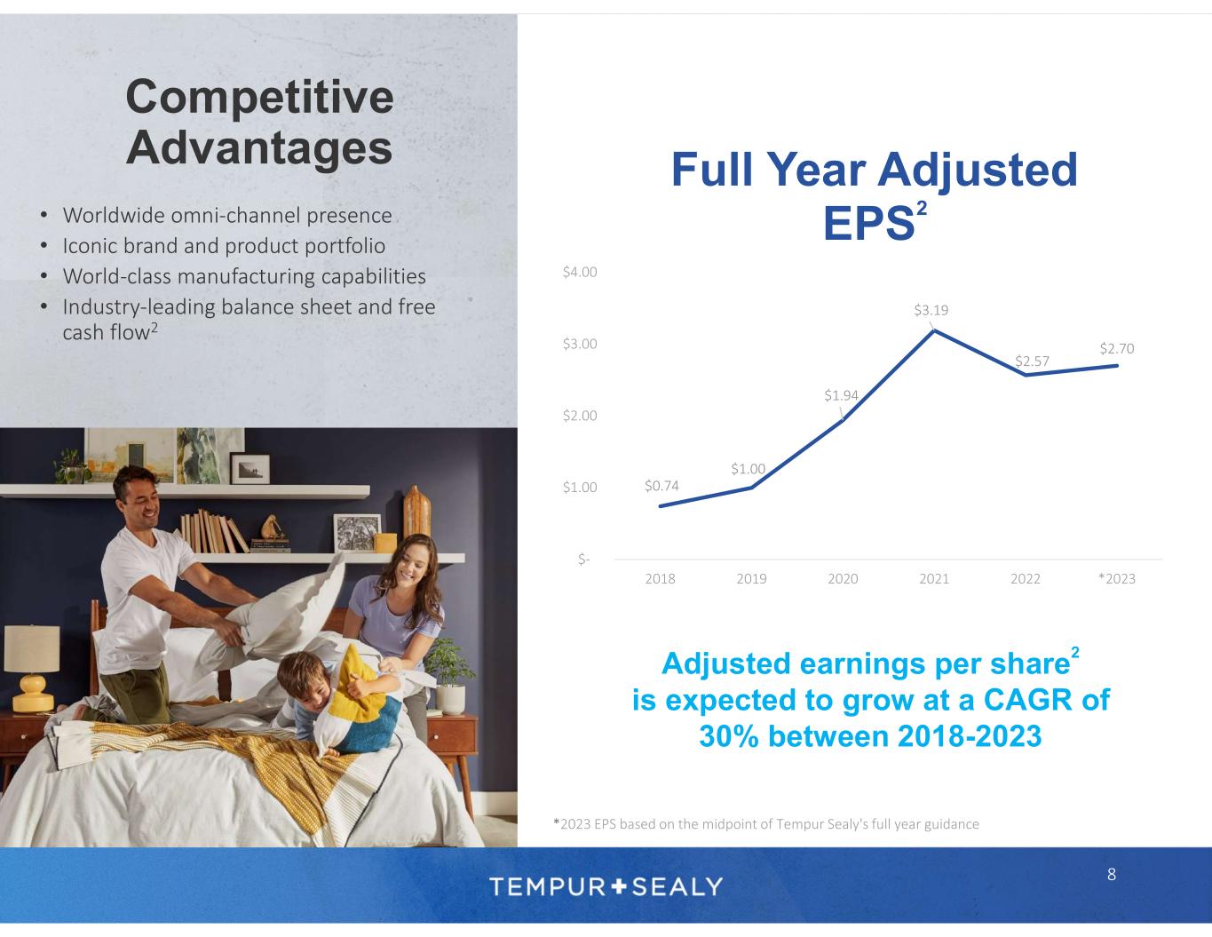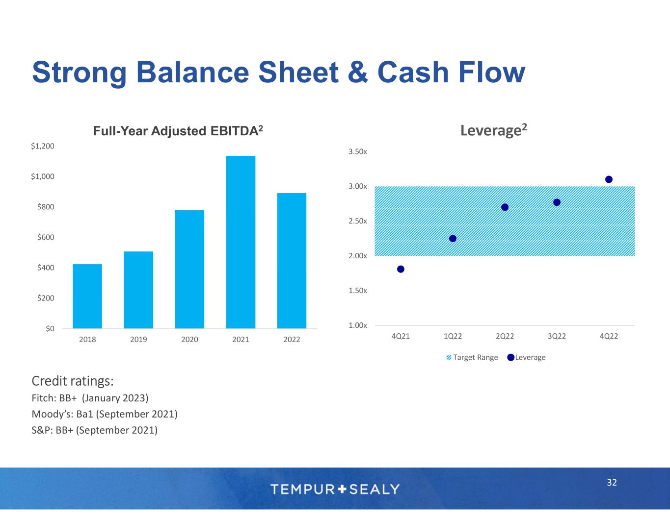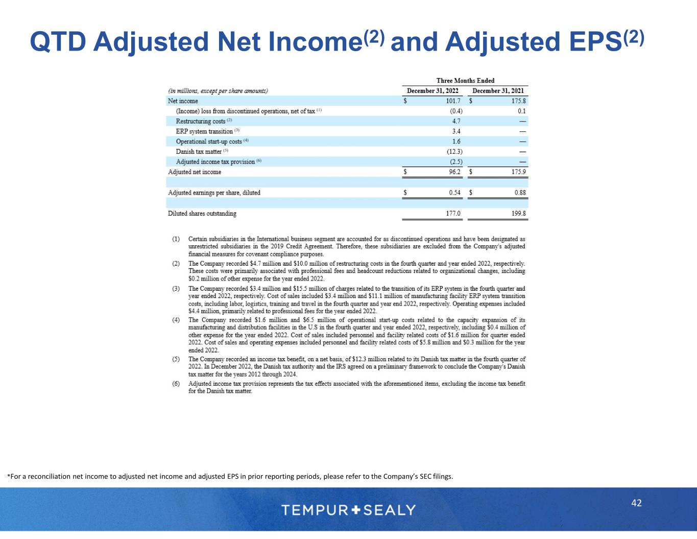 © 2023 Tempur Sealy International, Inc. All rights reserved. 1 Management estimates 2 Adjusted net income, EBITDA, adjusted EBITDA, adjusted EPS, leverage, and free cash flow are non-GAAP financial measures. Please refer to the “Use of Non-GAAP Financial Measures Information” on a previous slide for more information regarding the definitions of adjusted net income, EBITDA, adjusted EBITDA, adjusted EPS, leverage, and free cash flow, including the adjustments (as applicable) from the corresponding GAAP information. Please refer to “Forward-Looking Statements” and “Limitations on Guidance” on a previous slide. 3 Sealy® was ranked number one on Furniture Today’s list of the Top 20 U.S. Bedding Producers in June 2021. See Furniture Today’s Top 20 U.S. Bedding Producers methodology that includes Sealy® and Stearns & Foster® products in Sealy ranking. Tempur-Pedic® was ranked number two on Furniture Today’s list of the Top 20 U.S. Bedding Producers in June 2021. Tempur- Pedic® brand was awarded #1 in Customer Satisfaction for both the Retail Mattress and Online Mattress categories in the U.S. in the J.D. Power 2022 Mattress Satisfaction Report. 4 Based on the Company’s 2023 financial targets provided in the press release dated February 9, 2023, and the related earnings call on February 9, 2023. Please refer to “Forward-Looking Statements” and “Limitations on Guidance.” The Company is unable to reconcile forward-looking adjusted EPS, a non-GAAP financial measure, to EPS, its most directly comparable forward-looking GAAP financial measure, without unreasonable efforts, because the Company is currently unable to predict with a reasonable degree of certainty the type and extent of certain items that would be expected to impact EPS in 2023. Footnotes