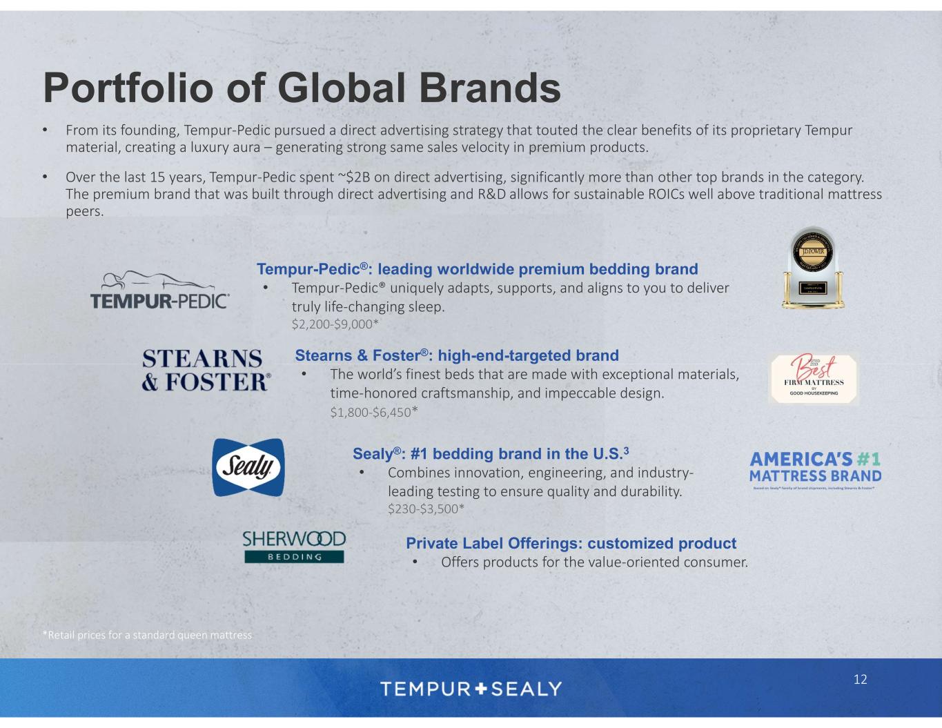 Tempur-Pedic®: leading worldwide premium bedding brand • Tempur-Pedic® uniquely adapts, supports, and aligns to you to deliver truly life-changing sleep. $2,200-$9,000* Stearns & Foster®: high-end-targeted brand • The world’s finest beds that are made with exceptional materials, time-honored craftsmanship, and impeccable design. $1,800-$6,450* Sealy®: #1 bedding brand in the U.S.3 • Combines innovation, engineering, and industry- leading testing to ensure quality and durability. $230-$3,500* Private Label Offerings: customized product • Offers products for the value-oriented consumer. Portfolio of Global Brands 12 • From its founding, Tempur-Pedic pursued a direct advertising strategy that touted the clear benefits of its proprietary Tempur material, creating a luxury aura – generating strong same sales velocity in premium products. • Over the last 15 years, Tempur-Pedic spent ~$2B on direct advertising, significantly more than other top brands in the category. The premium brand that was built through direct advertising and R&D allows for sustainable ROICs well above traditional mattress peers. *Retail prices for a standard queen mattress
