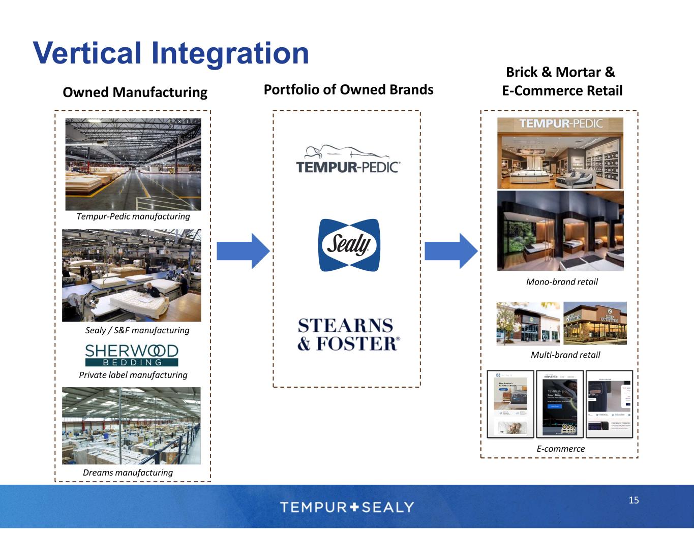 • Significant worldwide sales growth • Highly profitable and expanding rapidly • Direct customer relationships Ecommerce • Luxury Tempur-Pedic®, Dreams, and multi-branded showroom experiences • Operate over 700 stores worldwide and expanding direct customer relationships • Highly profitable Company- Owned Stores • Third-party retailers are our largest distribution channel • Significant private label opportunity • Valued supplier, win-win relationships Wholesale Successful Omni-Distribution Platform 14