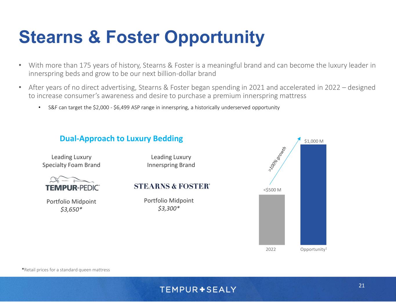 20 Stearns & Foster Opportunity Product Investments • Launched new, innovative Stearns & Foster products in 4Q’22 Marketing Investments • Supported Stearns & Foster with record advertising in 2022 and continued investments in 2023 Opportunity to grow Stearns & Foster to be our next $1 BILLION BRAND, more than doubling its size today Channel Investments • Expanding Stearns & Foster presence through new e-commerce platform launched in 2Q’22