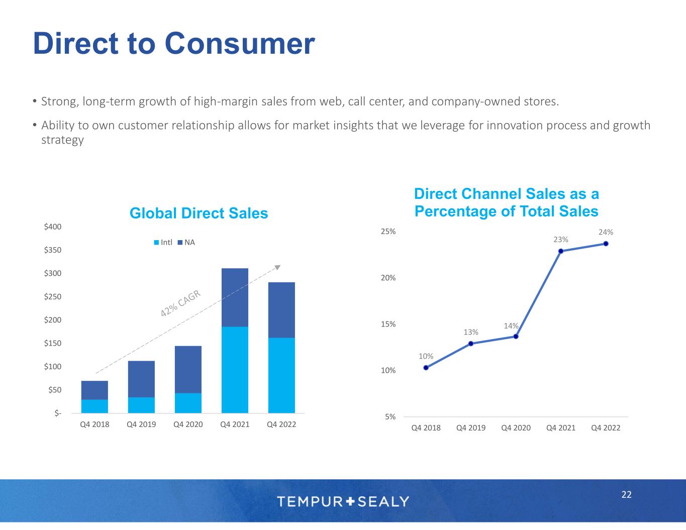 <$500 M $1,000 M 21 • With more than 175 years of history, Stearns & Foster is a meaningful brand and can become the luxury leader in innerspring beds and grow to be our next billion-dollar brand • After years of no direct advertising, Stearns & Foster began spending in 2021 and accelerated in 2022 – designed to increase consumer’s awareness and desire to purchase a premium innerspring mattress • S&F can target the $2,000 - $6,499 ASP range in innerspring, a historically underserved opportunity Stearns & Foster Opportunity Dual-Approach to Luxury Bedding Leading Luxury Specialty Foam Brand Portfolio Midpoint $3,650* Leading Luxury Innerspring Brand Portfolio Midpoint $3,300* 2022 Opportunity1 *Retail prices for a standard queen mattress
