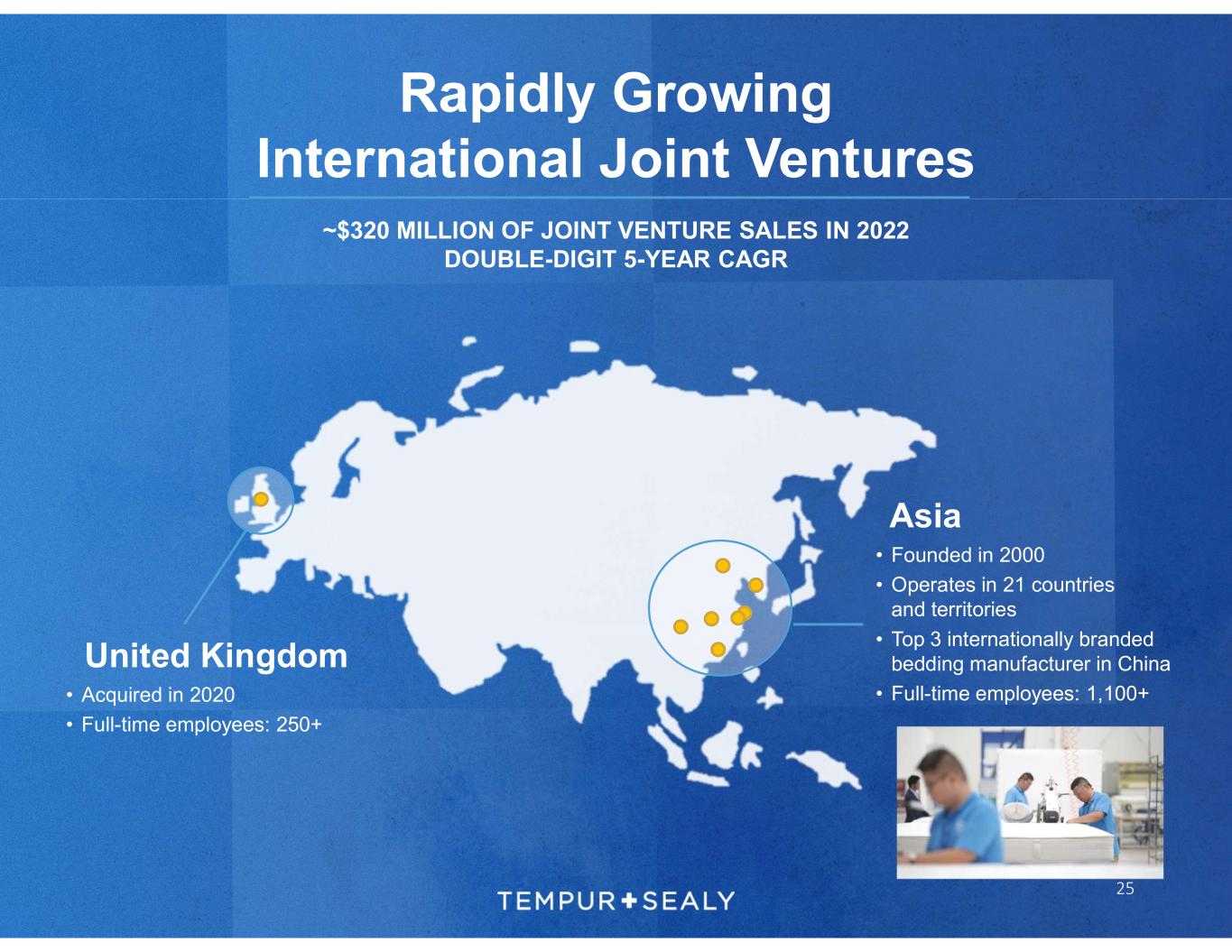 • Highly fragmented with broad geographic diversity across Europe and Asia • TEMPUR sold in 90+ countries, 22 countries served through wholly owned subsidiaries, rest by distributors • Acquired Dreams, the leading bedding retailer in the UK in 2021 • Launching new TEMPUR® line of mattresses to expand addressable market in 2023 • Tempur Sealy customizes approach by country • Europe: success with high-quality products, targeting growth through distribution, and new Sealy®-UK joint venture and Dreams acquisition • Asia: opportunity in emerging area through distribution and organic sales growth initiatives International Markets 24 Wholly-owned Third-party distributors
