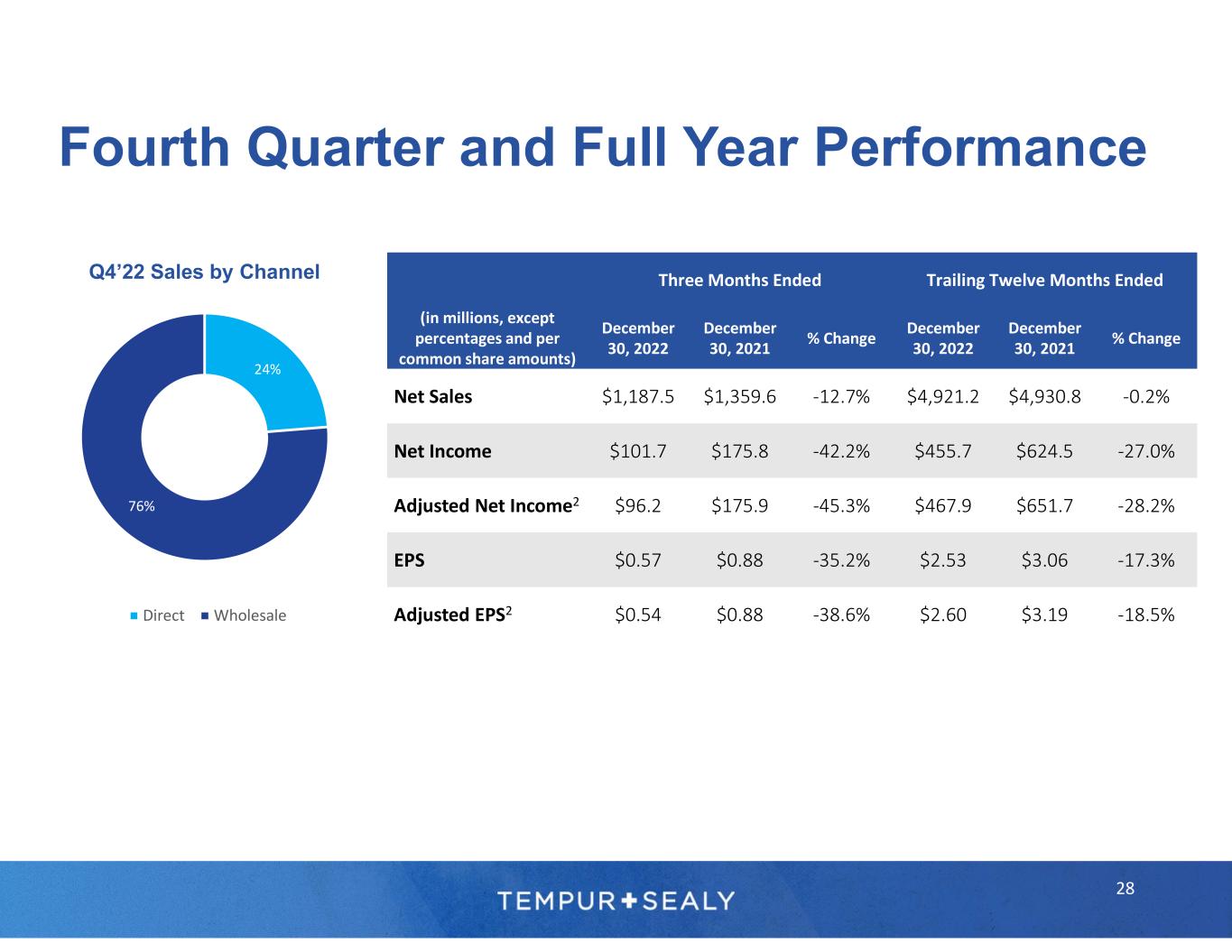 Three Months Ended Trailing Twelve Months Ended (in millions, except percentages and per common share amounts) December 30, 2022 December 30, 2021 % Change December 30, 2022 December 30, 2021 % Change Net Sales $1,187.5 $1,359.6 -12.7% $4,921.2 $4,930.8 -0.2% Net Income $101.7 $175.8 -42.2% $455.7 $624.5 -27.0% Adjusted Net Income2 $96.2 $175.9 -45.3% $467.9 $651.7 -28.2% EPS $0.57 $0.88 -35.2% $2.53 $3.06 -17.3% Adjusted EPS2 $0.54 $0.88 -38.6% $2.60 $3.19 -18.5% Fourth Quarter and Full Year Performance 28 Q4’22 Sales by Channel 24% 76% Direct Wholesale